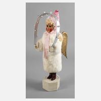 Mitte 20. Jh., ungemarkt, Holz beschnitzt, farbig gefasst, goldbronziert bzw. mit Schneeglimmer verziert, auf hexagonalem Sockel stehendes Christkind mit steckbaren Flügeln, Kunststoffkopf mit braunen Schlafaugen, blondem Lockenbesatz, rosafarbener Spitzenhaube und weißem Kaninchenfell-Mantel, einen Lichterbogen mit 15 Glühlämpchen haltend, in originalem Karton, guter altersgemäßer Zustand, H 46 cm, Maße Karton 49 x 25 x 15 cm. Info: Das Christkindl wurde traditionell zum ersten Weihnachtsfest dem Familiennachwuchs geschenkt, stand von Heilig Abend bis Lichtmess im Fenster und war mit der rosa Haube ein Zeichen für ein Mädchen im Haus. Quelle: Internet.