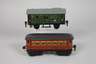 1930er Jahre, gemarkt und bezeichnet, Blech farbig lackiert, Spur 0, bestehend aus 20 Volt Schlepptenderlok R 66/12920, Achsfolge B, vor- und rückwärtsfahrend, mit Fernschaltung, zwei elektrischen Stirnlampen, Steckanschluss für Wagenbeleuchtung, Galeriestange, kleine geteilte Windleitbleche und zweiachsigem Kohletender, dazu Postwagen 17330 sowie Mitropa Speisewagen 1886 mit Zelluloidfenstern und Inneneinrichtung, alle vierachsig, Türen zum Öffnen und helle Puffer, Motor funktionstüchtig (Kurzschluss im Stromkreis), bespielter und restaurierter Zustand mit Altersspuren, L Lok gesamt 35,5 cm, L Wagen 18,5 und 21,5 cm.