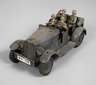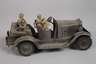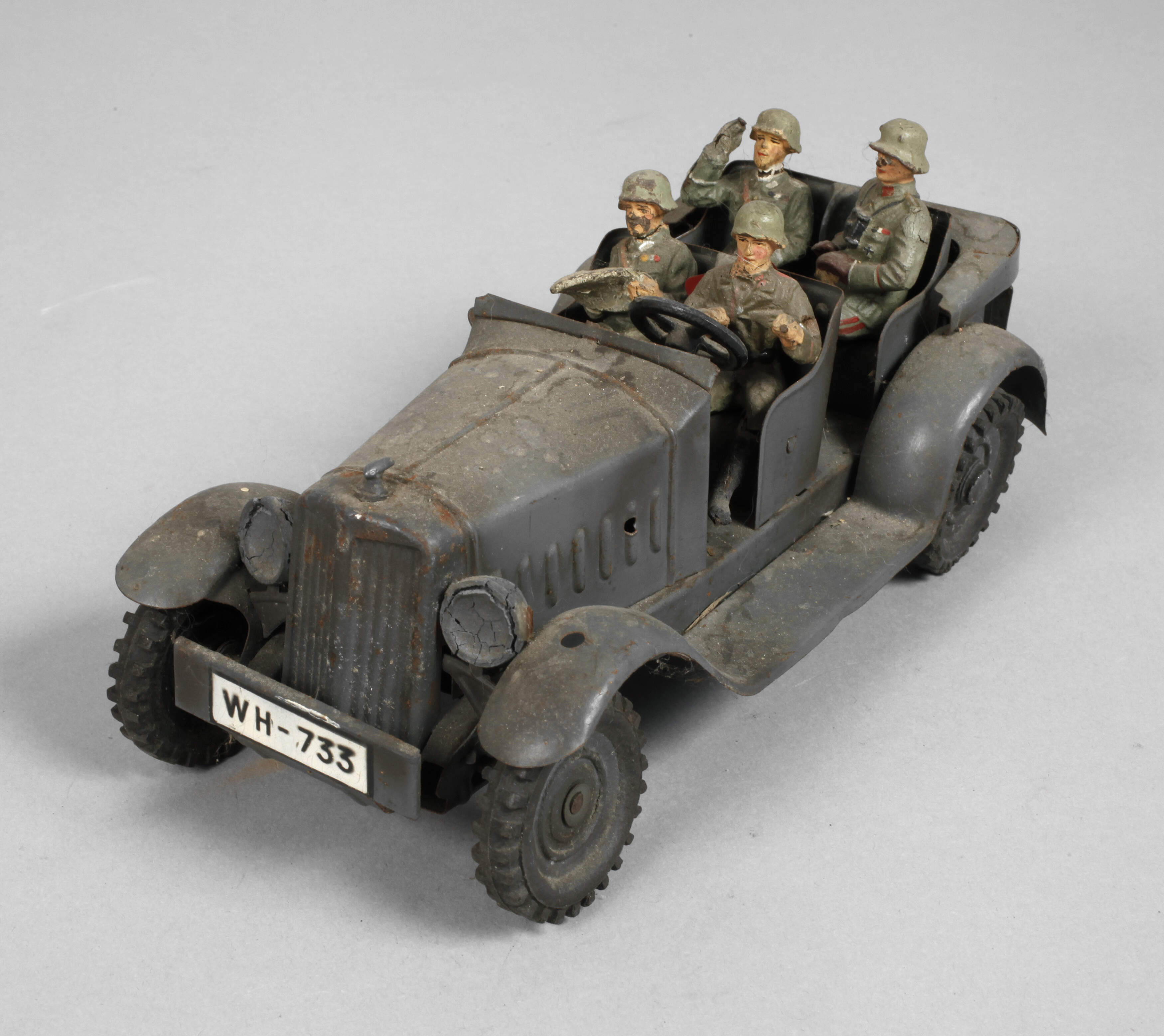 Modell WH-733, um 1935, gemarkt und bezeichnet, Blech feldgrau lackiert, Horch Geländewagen mit Uhrwerkantrieb, Stopp-Go-Hebel, zwei klappbaren Munitionskisten, Gummireifen und verstellbarer Vorderachse, dazu Stander und ein Rad (nicht abgebildet) sowie vier Massesoldaten als Besatzung, darunter General mit beweglichem Grußarm, bespielter, nicht ganz kompletter und reparaturbedürftiger Zustand mit Altersspuren, Figurengröße 7 und 7,5 cm, L Wagen 20,5 cm.