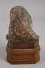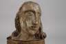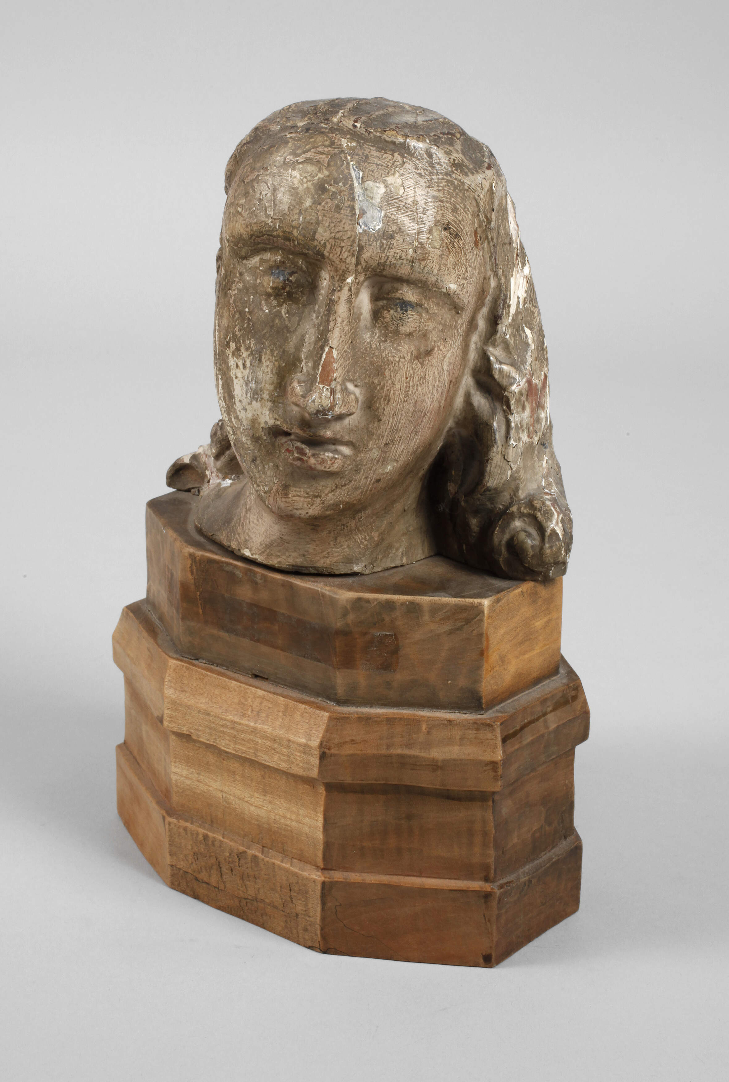 wohl 17. Jh., Holz geschnitzt, kreidegrundiert und farbig gefasst, weibliches Haupt mit entrücktem Blick auf doppeltem, späterem Holzsockel montiert, Erhaltungsmängel, H 26 cm.