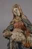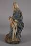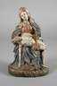 wohl 18. Jh., Holz geschnitzt, kreidegrundiert und farbig gefasst, vollplastisch gearbeitete Pieta der schmerzerfüllten Mutter Gottes, in ihrem Schoß den toten Sohn haltend, stärkere Altersspuren, restaurierungsbedürftig, H 26 cm.
