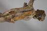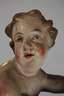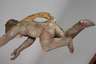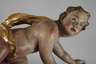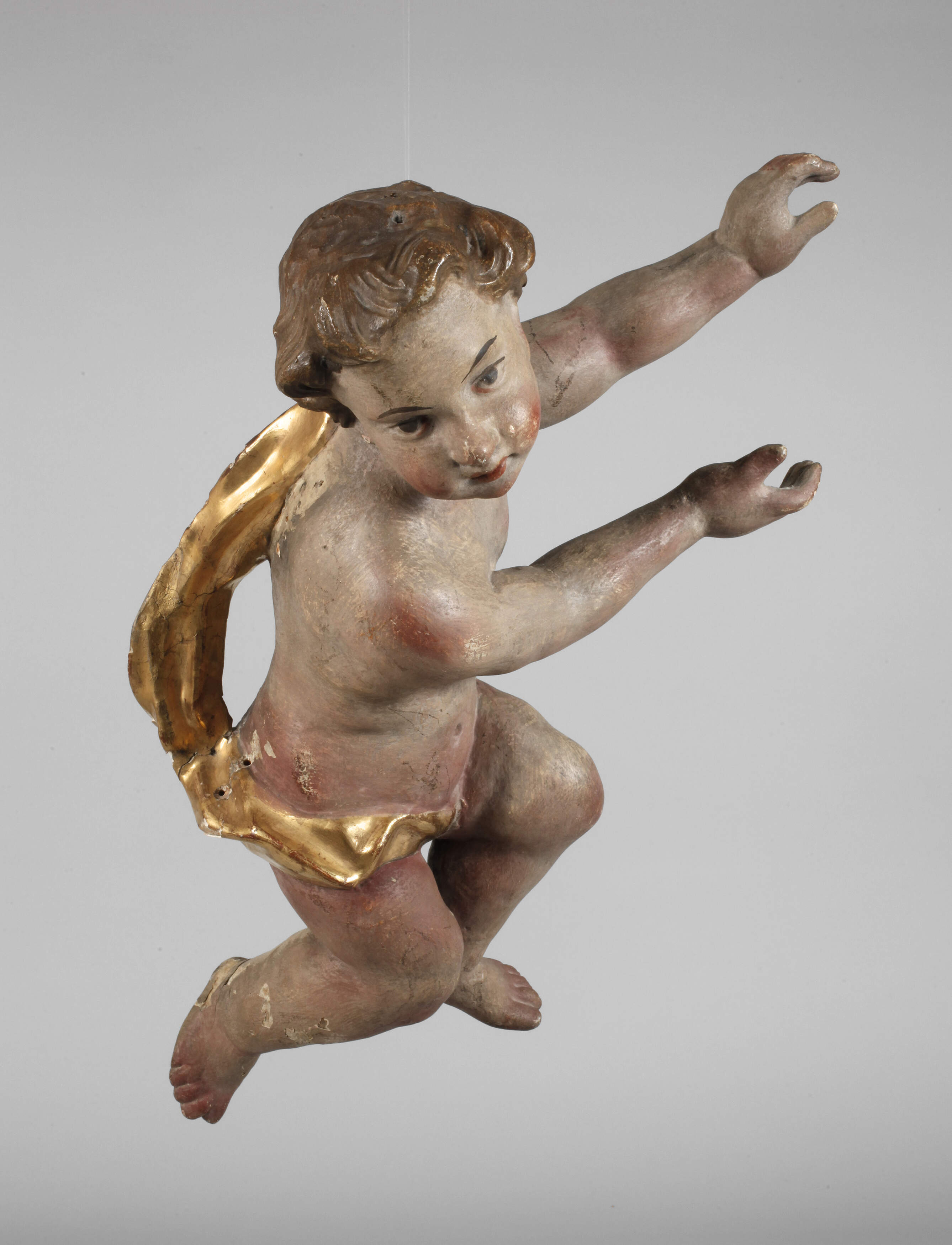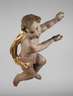 Anfang 18. Jh., Holz geschnitzt, gestuckt, farbig gefasst und goldbronziert, lediglich mit einem Tuch verhüllter Cherub im Fluge, die Augen verzückt gen Himmel gerichtet, nicht ganz komplett, Substanzverluste, L 61 cm.