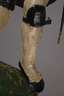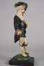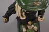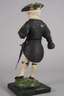 wohl 18. Jh., Holz beschnitzt, farbig gefasst und partiell goldbronziert, auf quadratischer Plinthe fixierte vollplastische Darstellung eines Bergmanns im Habitus des 16. Jh., mit montierten Kniebügeln und Blankwaffe sowie unvollständigem Attribut in der rechten Hand, linke Hand geklebt und ohne Attribut, wohl als Lichterfigur mit Feuerstein und fehlender Froschlampe, ursprüngliche Farbfassung alt übergangen und mit partiellen Substanzverlusten, H 36 cm.
