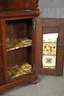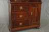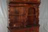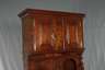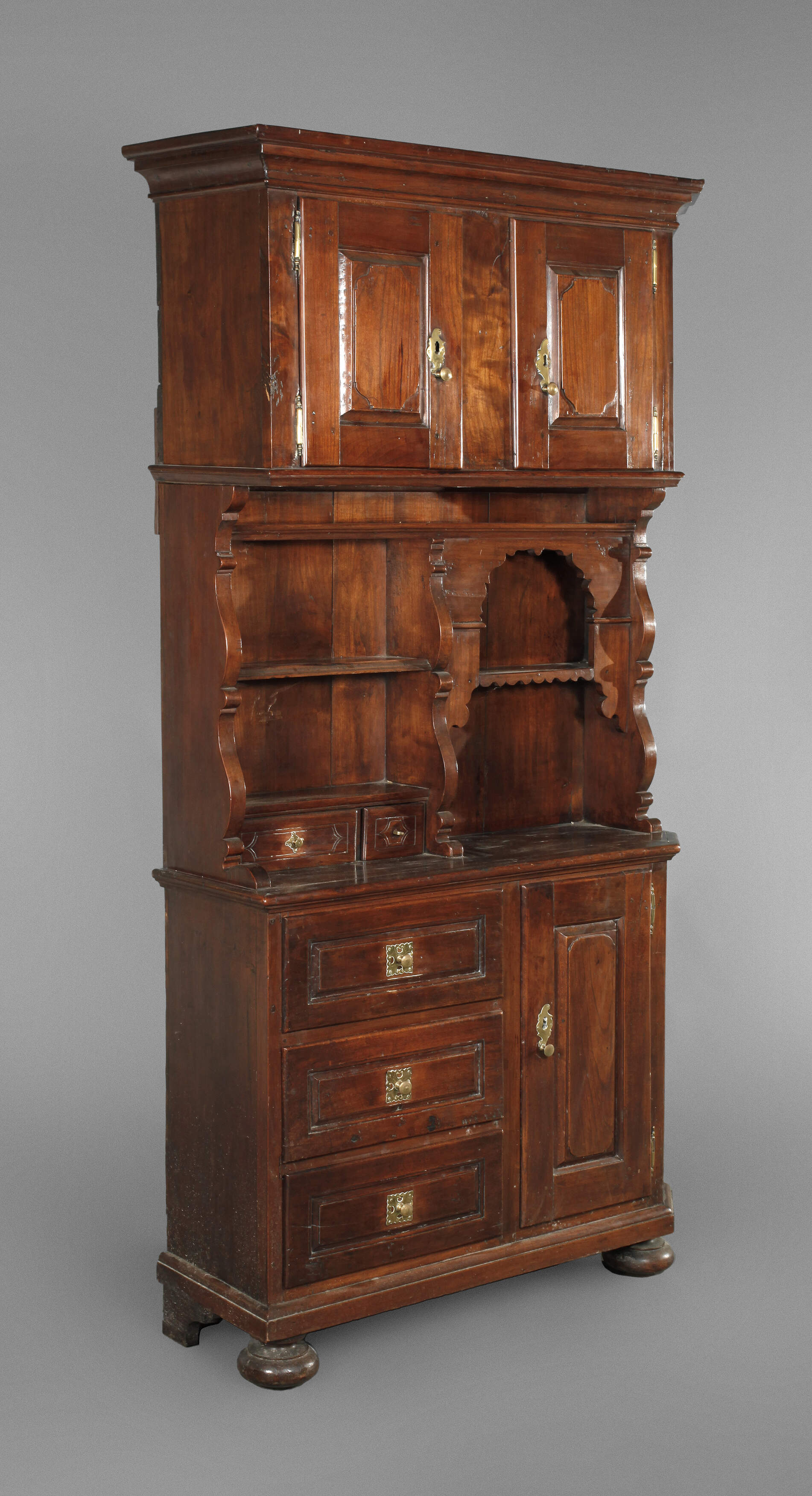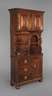 Schweiz, um 1800, Nussbaum massiv, schlanker dreiteiliger Korpus, einseitig abgeschrägt, mittig mit offenem Regal, das Unterteil mit drei Schüben und einer Tür, darüber Regaleinteilung und zweitüriger Aufsatz, originale Messingbeschläge, Schlösser und Schlüssel, guter Zustand mit Alters- und Gebrauchsspuren, Maße 200 x 98 x 36 cm.