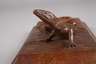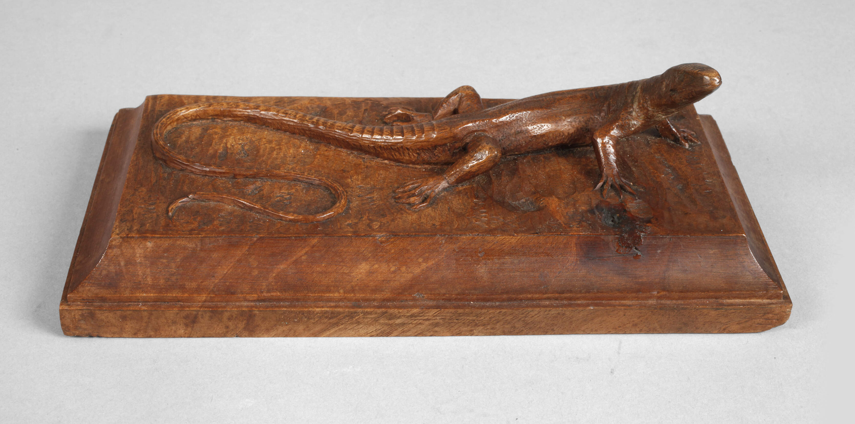 Anfang 20. Jh., Laubholz beschnitzt, auf langrechteckiger Plinthe plastisch gearbeitete Smaragdeidechse, gute Erhaltung, Maße 10 x 18 cm.