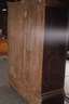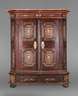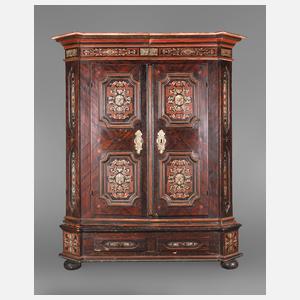 wohl Österreich, um 1750, Nadelholz massiv, mittig teilbarer, zweitüriger Kleiderschrank mit abgeschrägten Ecken und zwei außen liegenden Schubkästen, die Lisenen und Türen mit Kassettenfüllungen, feiner ornamentaler Dekor in Weiß und Rot über dunkelbrauner Maserungsimitation, weit ausladendes Profilgesims, der separate Sockel auf originalen gequetschten Kugelfüßen, Schloss fehlt, Alters- und Gebrauchsspuren, etwas restaurierungsbedürftig, Maße 190 x 156 x 62 cm.