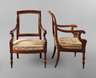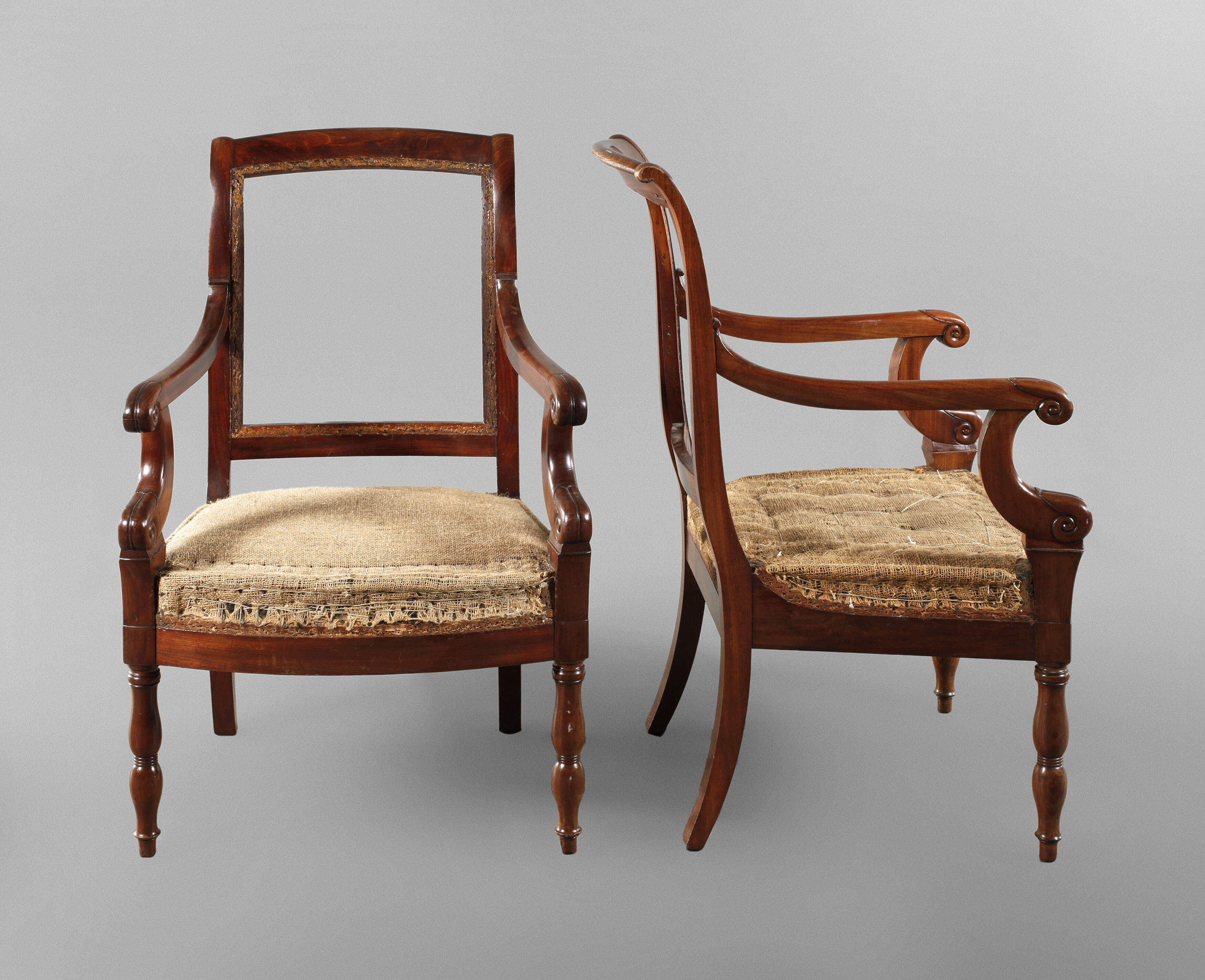 Paris, um ca. 1825, Mahagoni massiv und furniert, abgepolstert, stabiler Zustand, Rosshaarpolster in gutem Zustand, Oberfläche mit Gebrauchsspuren, Maße je 94 x 58 x 63 cm.