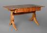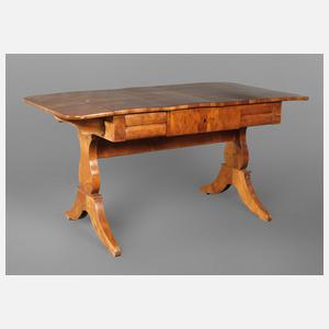 um 1820, Kirschbaum mit Birke auf Nadelholz furniert, frei im Raum stellbarer Tisch mit seitlich klappbarer Platte, Zarge einseitig mit Schubkasten, Seitenwangen mit Säbelfüßen, Alters- und Gebrauchsspuren, rest.bed., Maße 73 x 105 x (145) x 75 cm.