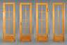 um 1920, vierflügelige Tür, aus massivem Nadelholz, hellbraun lasiert, jeweils mit acht facettgeschliffenen Scheiben verziert, Scharniere mit Federmechanismus, guter Zustand, Maße 210 x 240 x 6 cm.