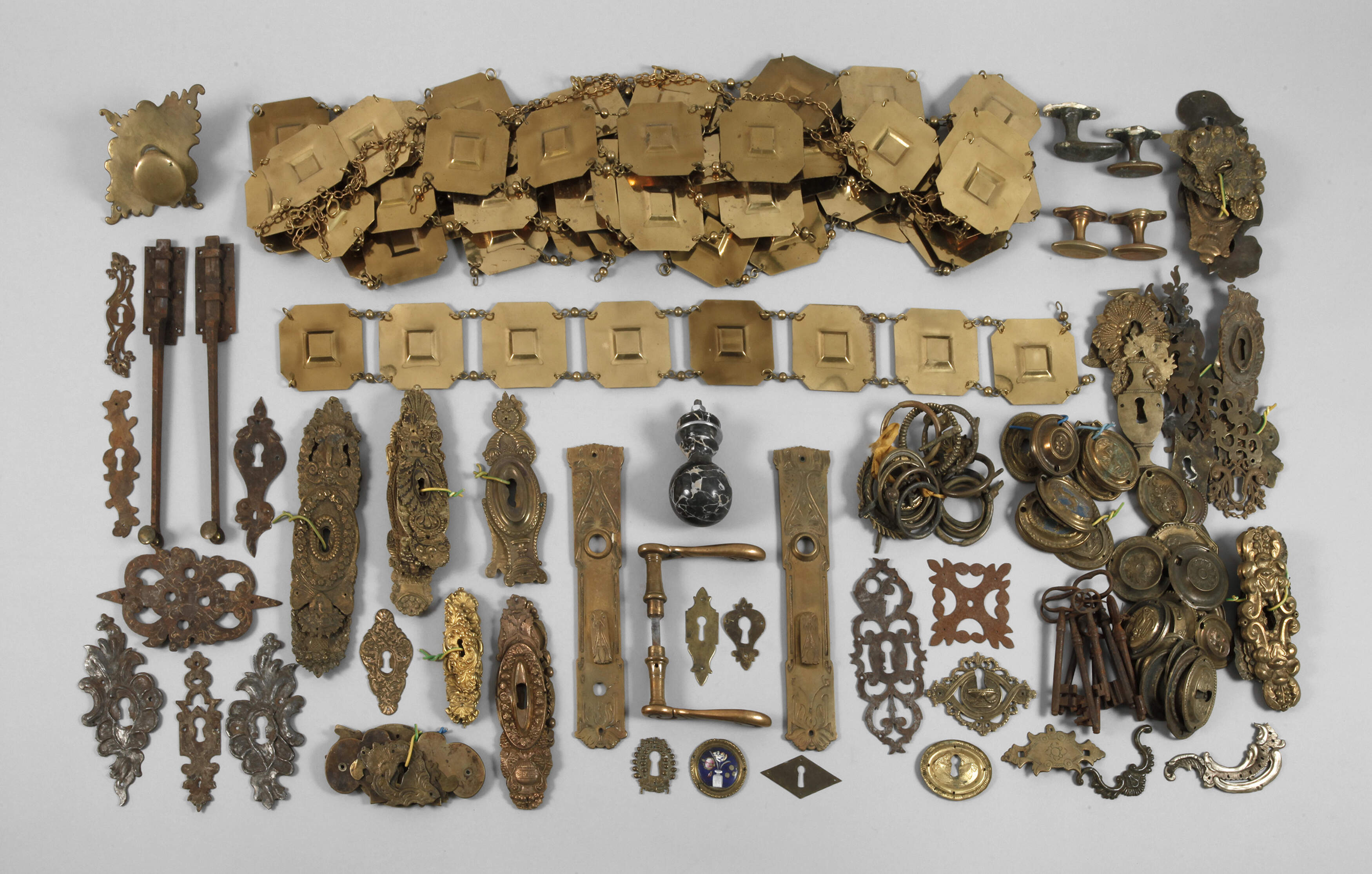 17.–20. Jh., Messing getrieben und Bronze gegossen, dazu einige gravierte Eisenbeschläge sowie eine Heizkörperverkleidung Richard Riemerschmid, auf Vollständigkeit nicht geprüft.