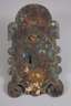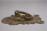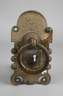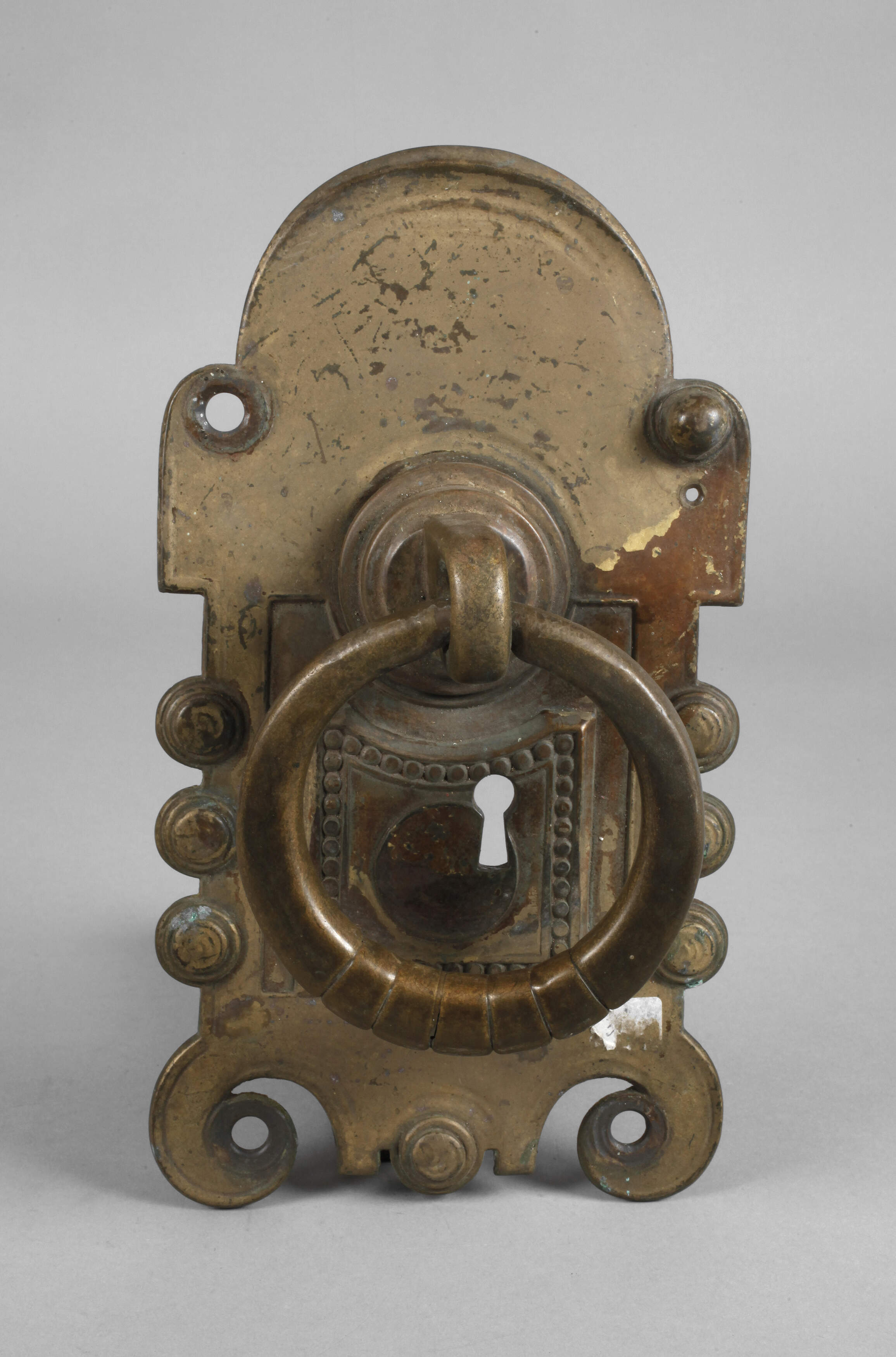 um 1900, Messing gegossen, mit Voluten verziertes Schild, mittig mit Schlüsselloch, Oberfläche mit Altersspuren, Maße 28 x 16 x 8 cm.