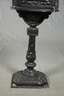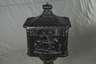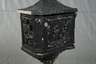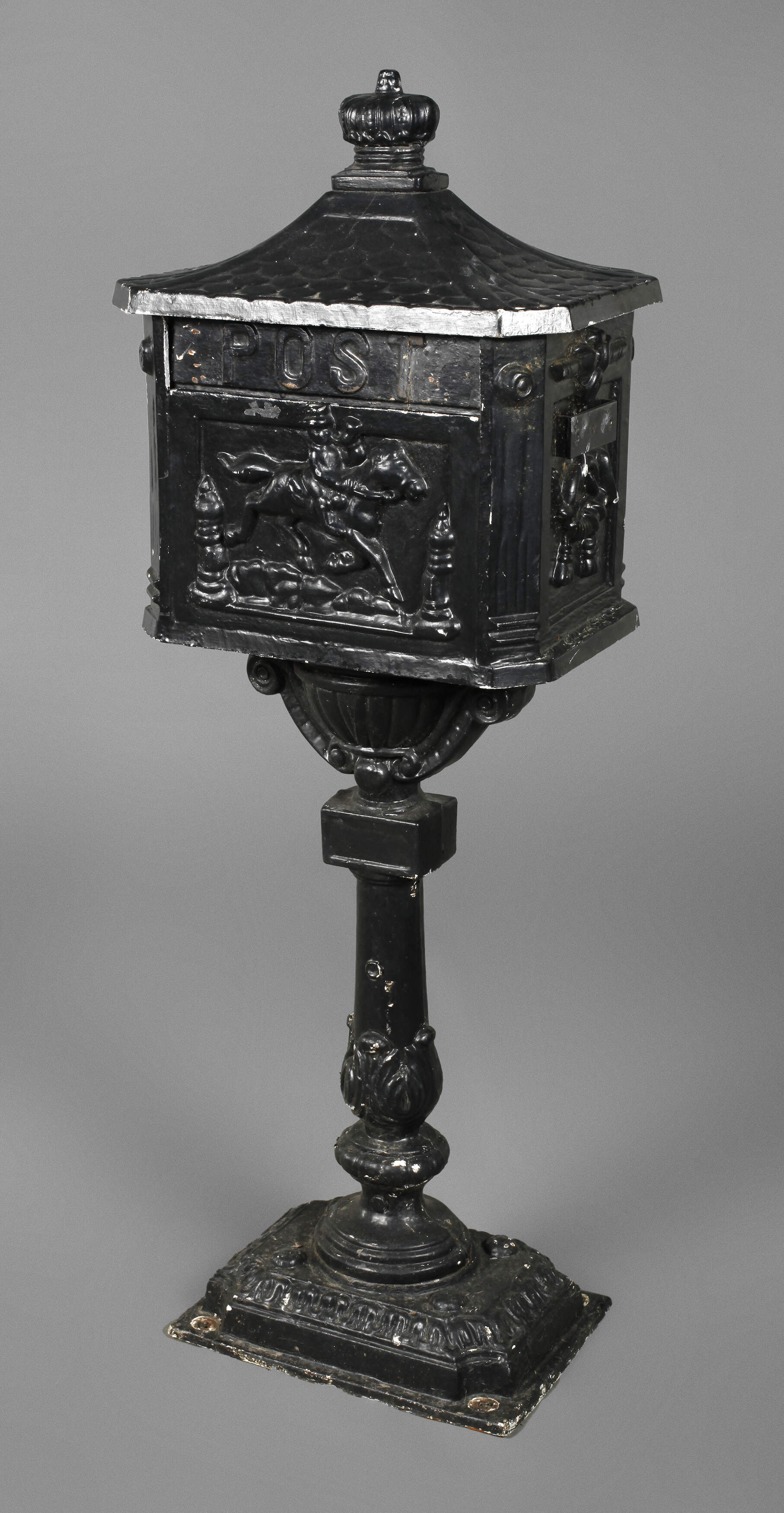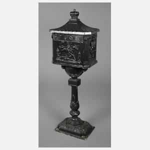 nach historischem Vorbild, 20. Jh., Eisen und Aluguss, mehrteilig verschraubt, schwarz gefasst, Fuß aus Eisenguss, rückseitig Tür mit Sicherheitsschloss, Briefschlitz mit alt reparierter Bruchstelle, Schlüssel fehlt, Oberfläche rest.bed., H 113 cm.