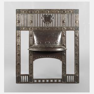 deutsch, um 1900, durchbrochen gearbeitete Verkleidung aus Schmiedeeisen und geprägtem Eisenblech, mit rapportierendem Ornamentdekor, vier quadratische Zierteile fehlen, sonst guter Originalzustand, Maße 125 x 100 cm.