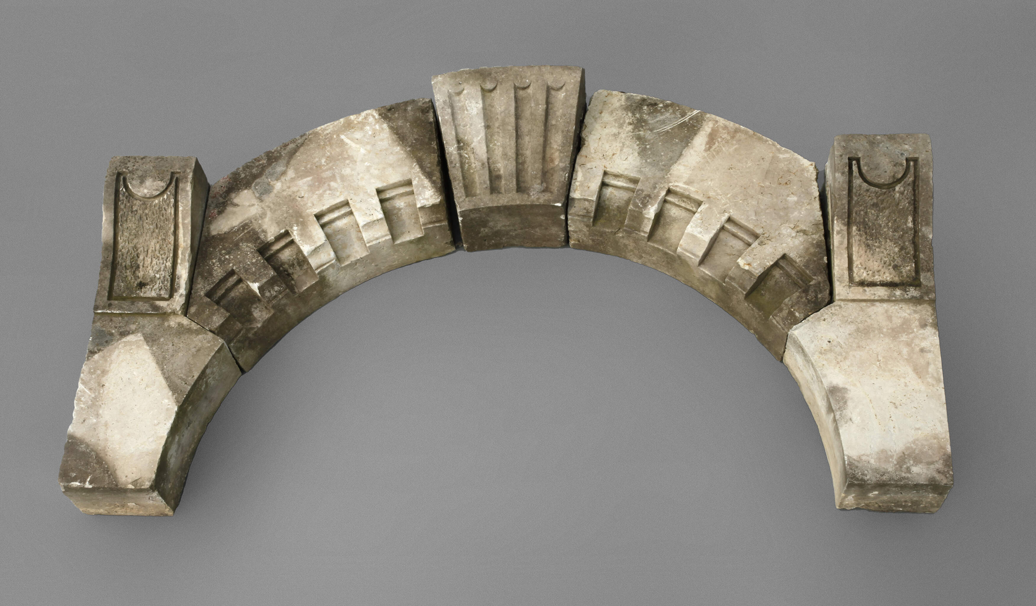 Sandstein gehauen, um 1860, Rundbogen aus sieben Teilen, mit Zahngesims und Kanneluren, sauber ausgebaut und auf einer Euro-Palette verpackt, Maße ca. 115 x 155 x 25 cm.