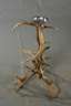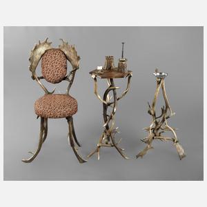 Anfang 20. Jh., bestehend aus Stuhl, Standascher und Rauchtisch, aus Rot- und Dammwildschaufeln gestaltete Kleinmöbel, der Stuhl mit gepolsterter Sitzfläche und Lehne, der Ascher mit Neusilbermontierung, der Tisch mit polygonal facettierter Rüsterplatte, fragmentarisch erhaltene Zigarrenschneider, Zigaretten- und Streichholzhalter, unterschiedliche Maße und Erhaltungen, H max. 100 cm.