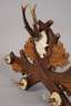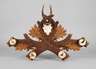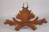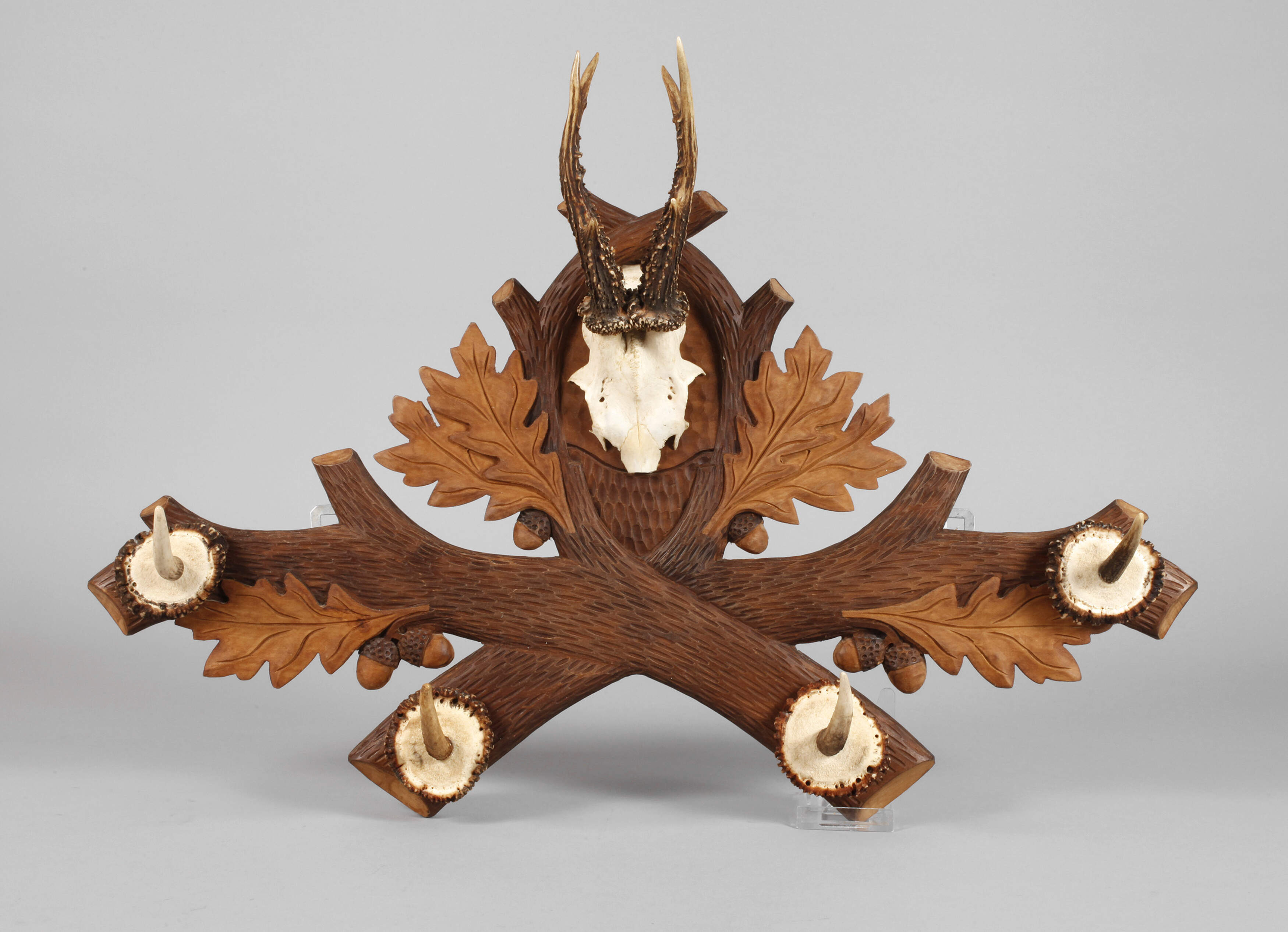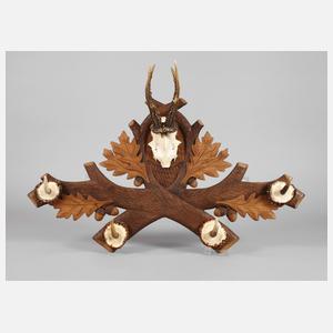 Mitte 20. Jh., Laubholz beschnitzt, bräunlich gefasst, Wandapplik in Form gekreuzter Eichenzweige mit vier aufgesetzten Haken und zentralem, präpariertem Gehörn eines Rehbocks, gute Erhaltung, L 68 cm.