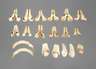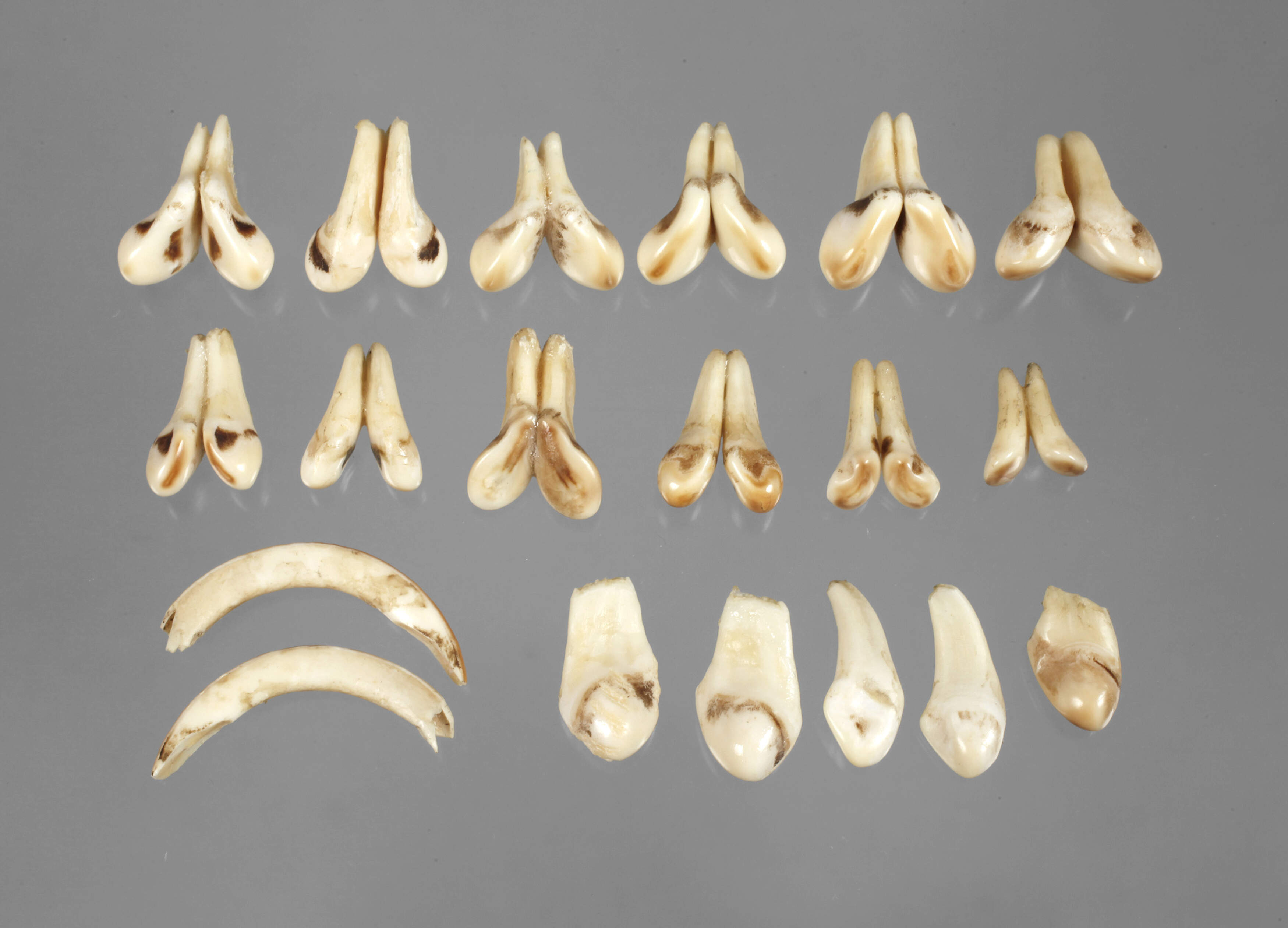 28 Stück, in verschiedenen Größen, vorwiegend paarweise zusammengeklebt, dazu zwei kleine Wildschweinhauer, L 5 cm.
