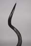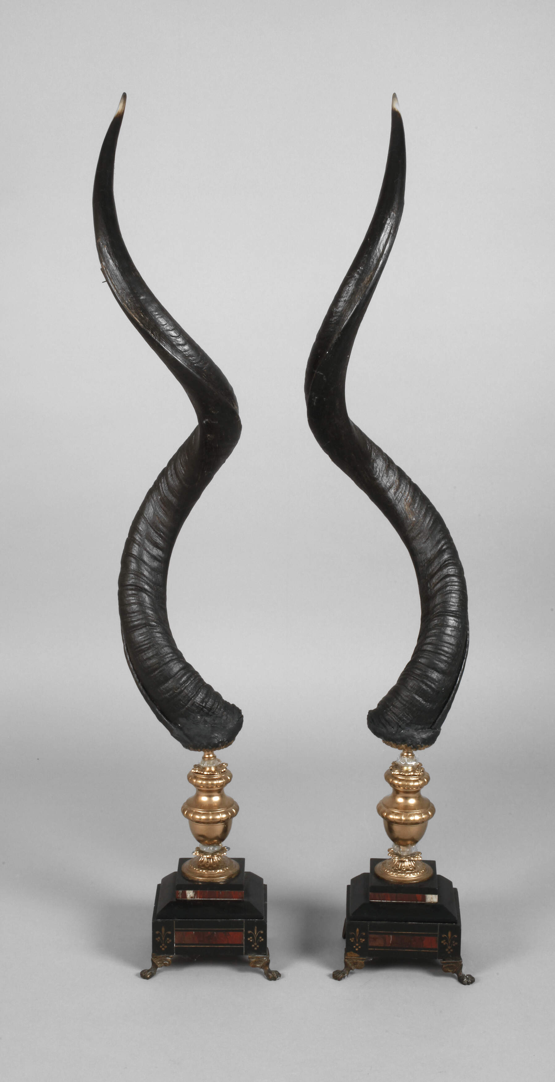 20. Jh., zwei mächtige Antilopenhörner, montiert auf Balusterschaft aus Bronze mit Zierelementen aus Glas, über getreppten dunklen Steinsockeln, Altersspuren, H je ca. 87 cm.