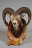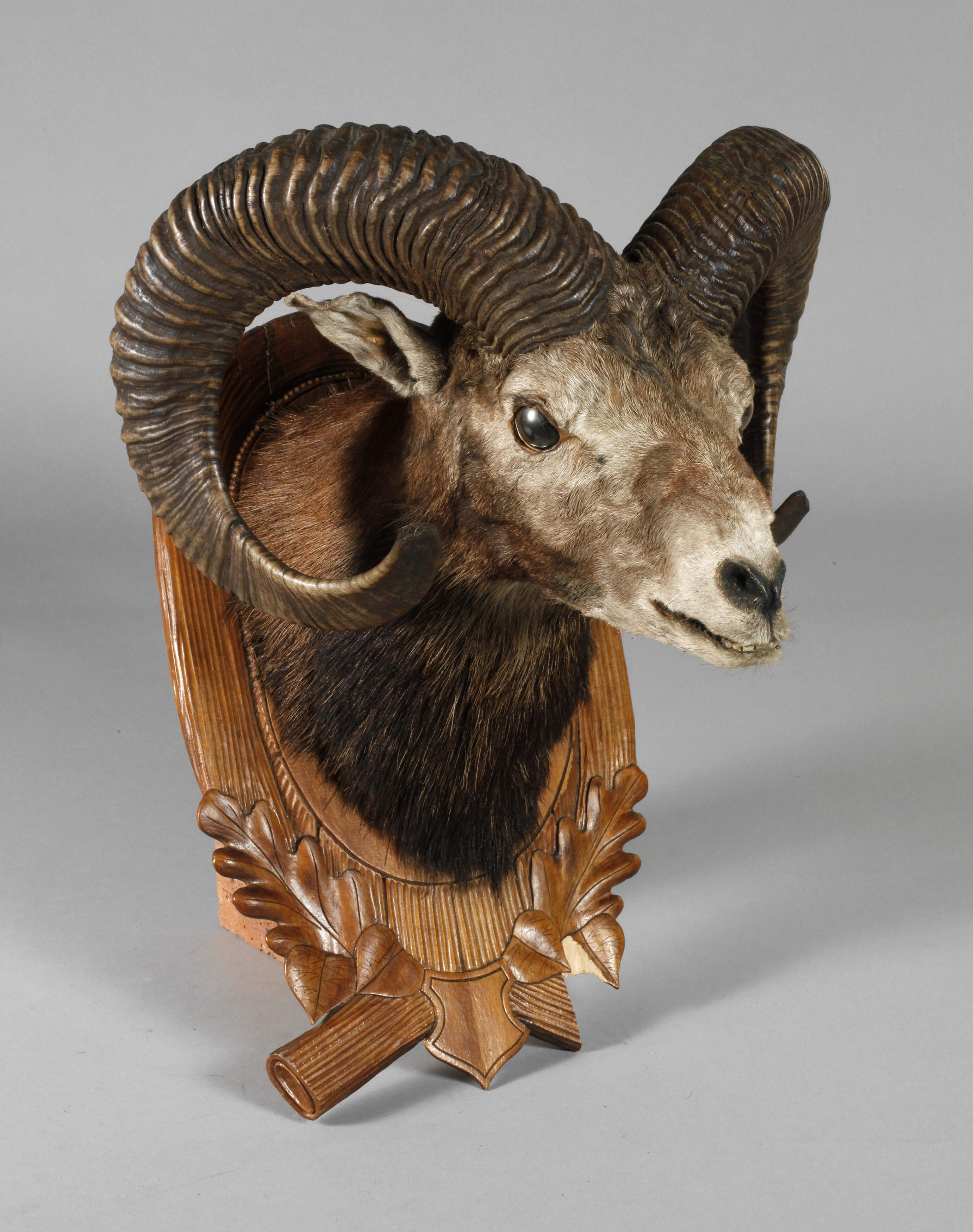 Mitte 20. Jh., komplett präpariertes Haupt eines Widders mit eingesetzten Glasaugen, auf beschnitztem Eichenholzbrett montiert, dieses mit Fehlstelle, sonst normale Altersspuren, H ca. 55 cm.