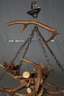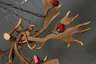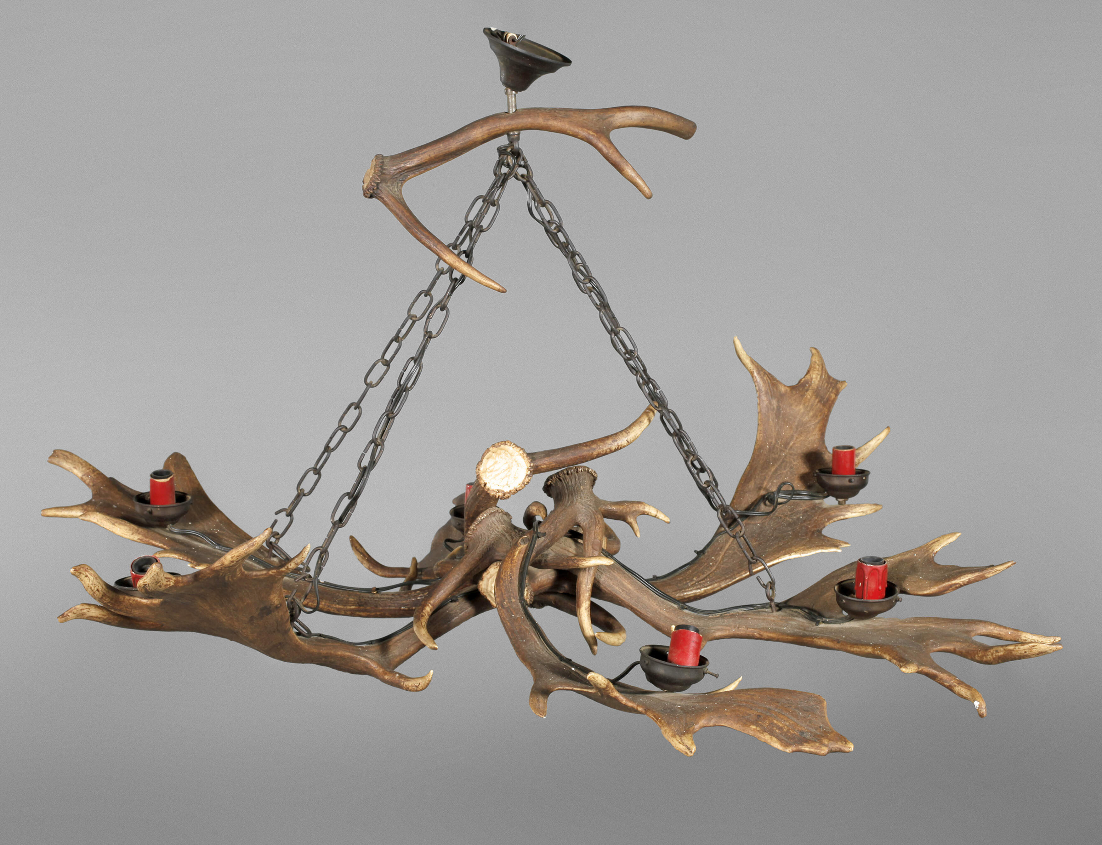 Mitte 20. Jh., aus Rot- und Damwildschaufeln gefertigter Lüster, an Gliederketten abgehängt, mit sechs aufgesetzten Tüllen, leichte Altersspuren, H 60 cm, D 100 cm.