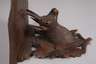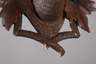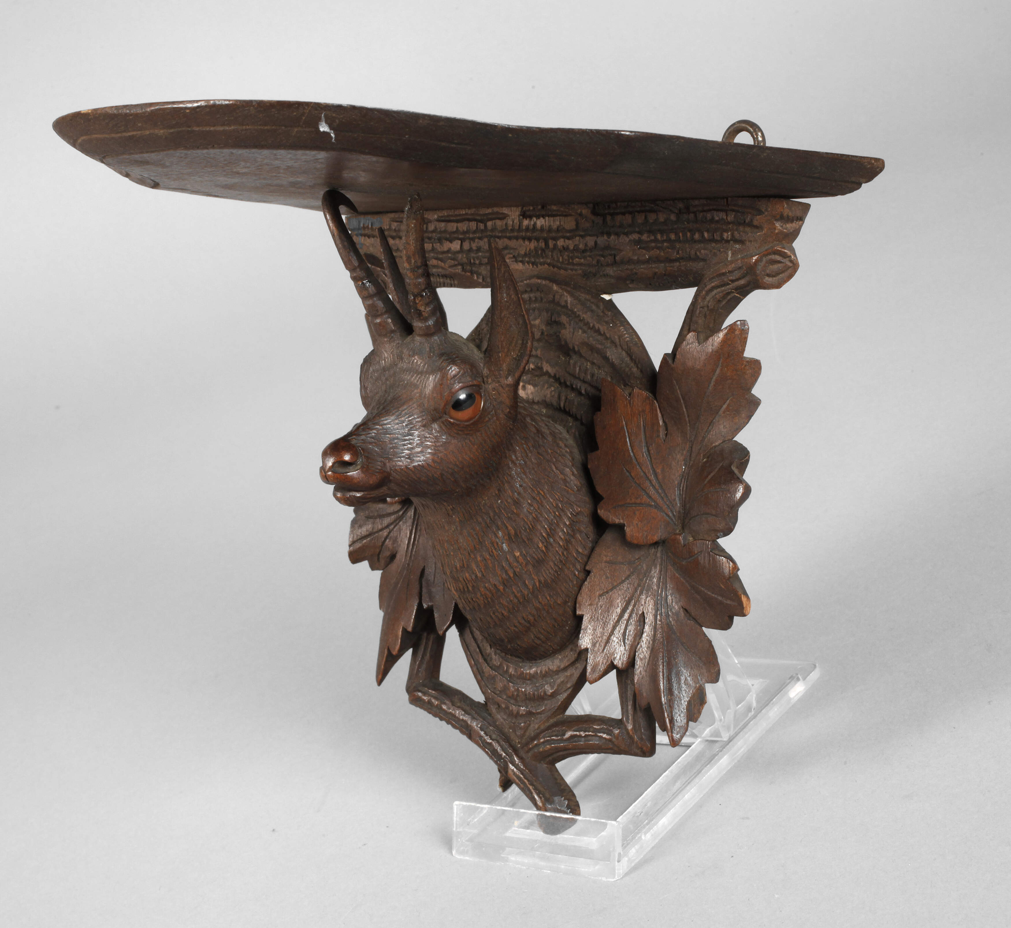 Brienz, Ende 19. Jh., Nussbaum beschnitzt und dunkel gefasst, passig geschweiftes kleines Wandboard mit plastisch gearbeitetem Gamskopf, dieser mit eingesetzten Glasaugen, gerahmt von Blattwerk, kleinere Fehlstellen, Maße 18 x 20 x 14 cm.