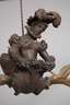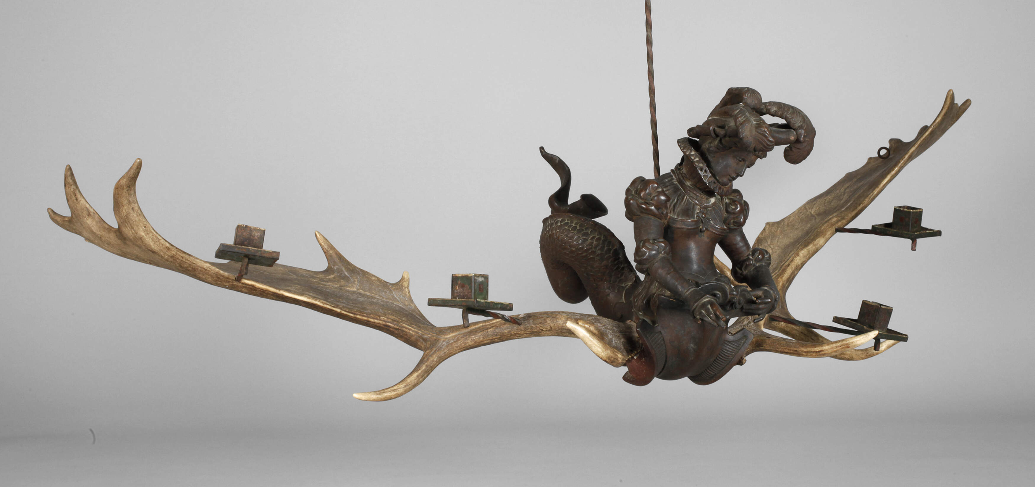 1. Hälfte 20. Jh., Regule mehrteilig gefertigt und montiert, mit angesetzten Damwildschaufeln sowie vier Tüllen aus Schmiedeeisen, historisierende Frauengestalt nach einem Entwurf von Albrecht Dürer, Alters- und Korrosionsspuren, L 115 cm.