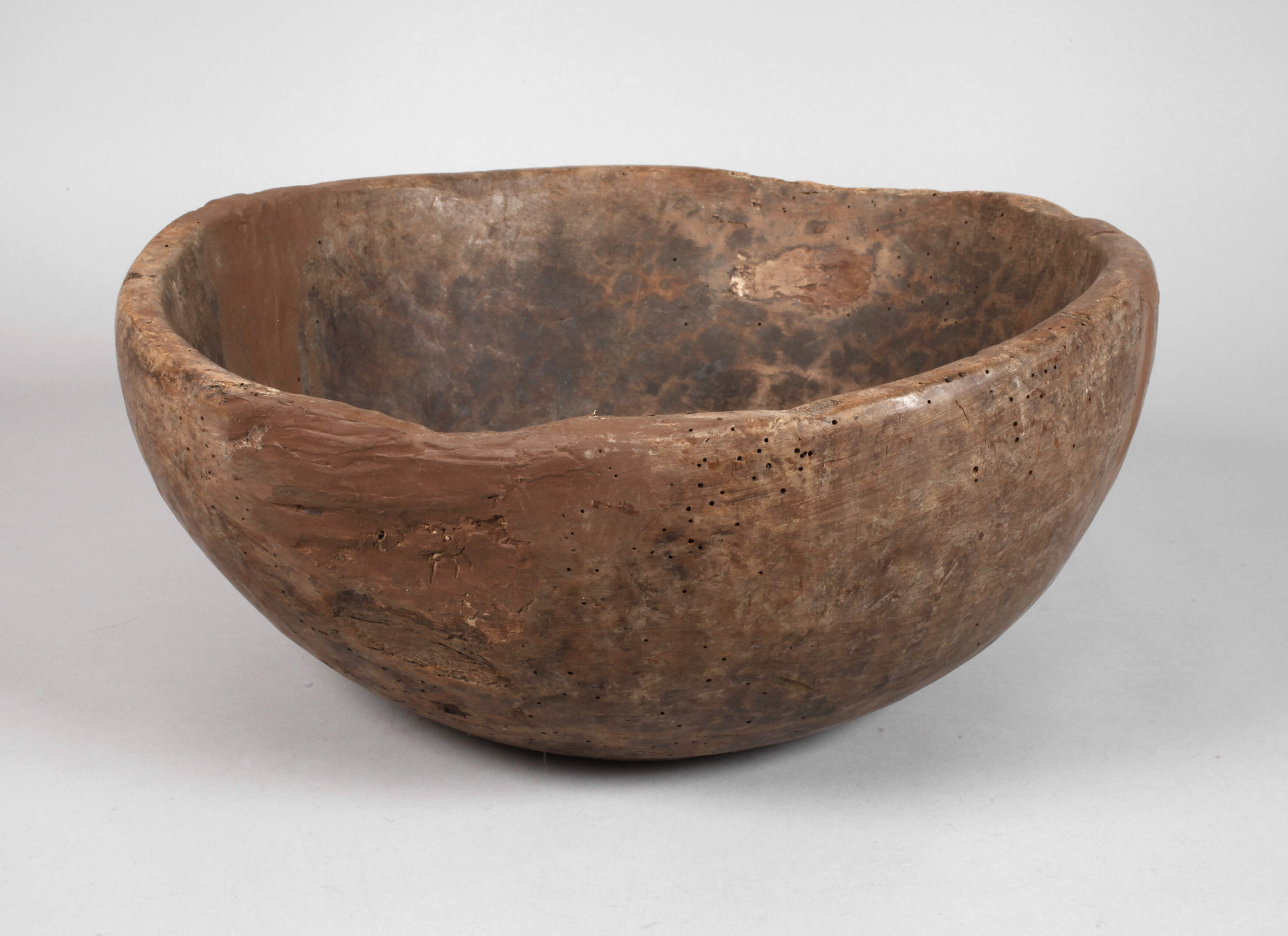 18. Jh. oder älter, Holz geschnitzt, dunkel gefasst, alt repariert, holzwurmstichig, D 42 cm.