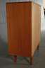 rückseitig gestempelt Made in Denmark, H. T. Hansen Möbelindustrie, um 1960, Teakholz massiv, alle Kanten abgerundet, Schiebetür mit Griffmulden, innen zwei höhenverstellbare Regalböden, guter unrestaurierter Originalzustand, Maße 130 x 120 x 50 cm.