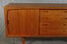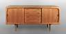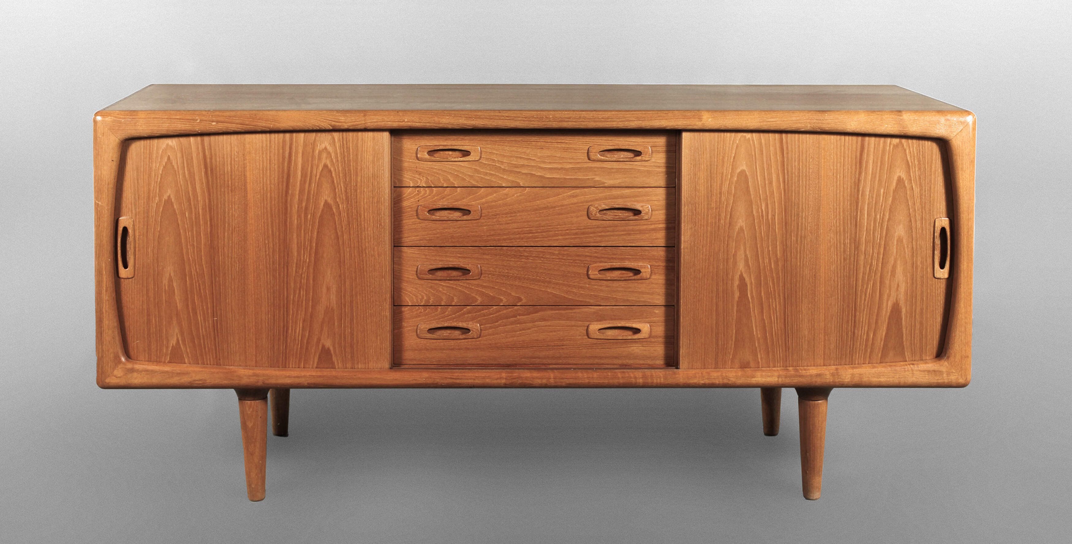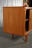 rückseitig gestempelt Made in Denmark, H. T. Hansen Möbelindustrie, um 1960, Teakholz massiv, alle Kanten abgerundet, Schiebetür mit Griffmulden, innen zwei höhenverstellbare Regalböden, guter, unrestaurierter Originalzustand, Maße 80 x 170 x 50 cm.