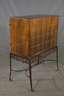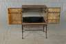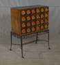 1950er Jahre, auf Rollen gelagertes schmiedeeisernes Gestell, darauf zweitüriger Schrank aus grünlich gebeiztem Buchenholz, die Türen mit brandschattierten Intarsien verziert, kreisrunde Floralelemente und Runen, innen mit schwarzem Glasboden und verspiegelter Rückwand, ein schmiedeeisernes Zierelement lose beigegeben, sonst guter Zustand, mit Schlüssel, Maße 94 x 71 x 35 cm.