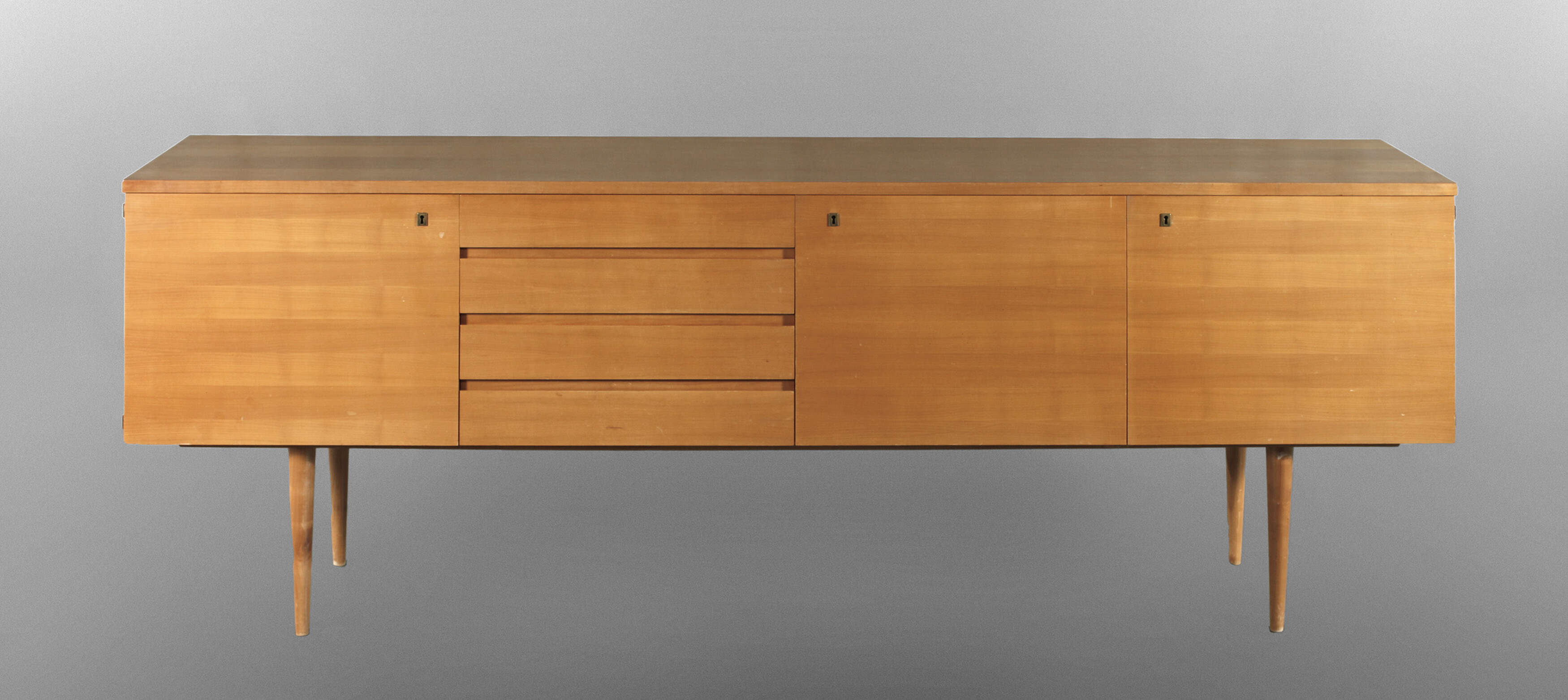 Schweden, 1960er Jahre, in Kirschbaum und Weißbuche furniert, flacher Korpus mit vier Schubladen und drei Türen, mit einem Originalschlüssel, ein Bein locker, normale Alters- und Gebrauchsspuren, Maße 84 x 225 x 48 cm.