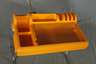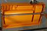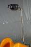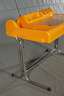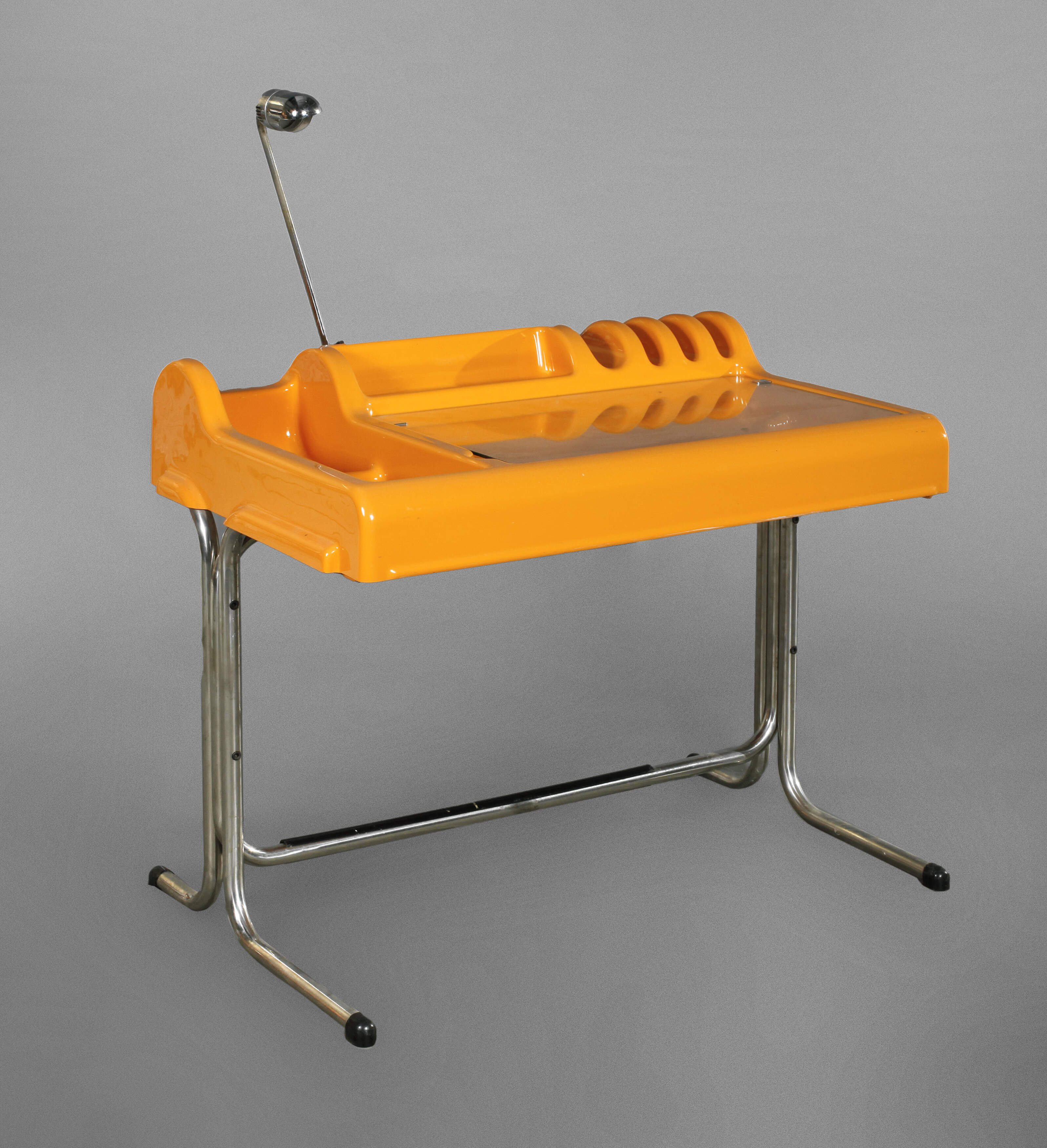 Entwurf Vittorio Pariki und Nani Prina für Molteni 1970, orangefarbener Kunststoff, schwenkbare Arbeitsplatte aus Glas, Gestell aus verchromtem Stahlrohr mit integrierter Leuchte, guter unrestaurierter Originalzustand, Maße 83 x 103 x 63 cm.