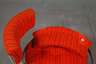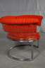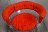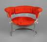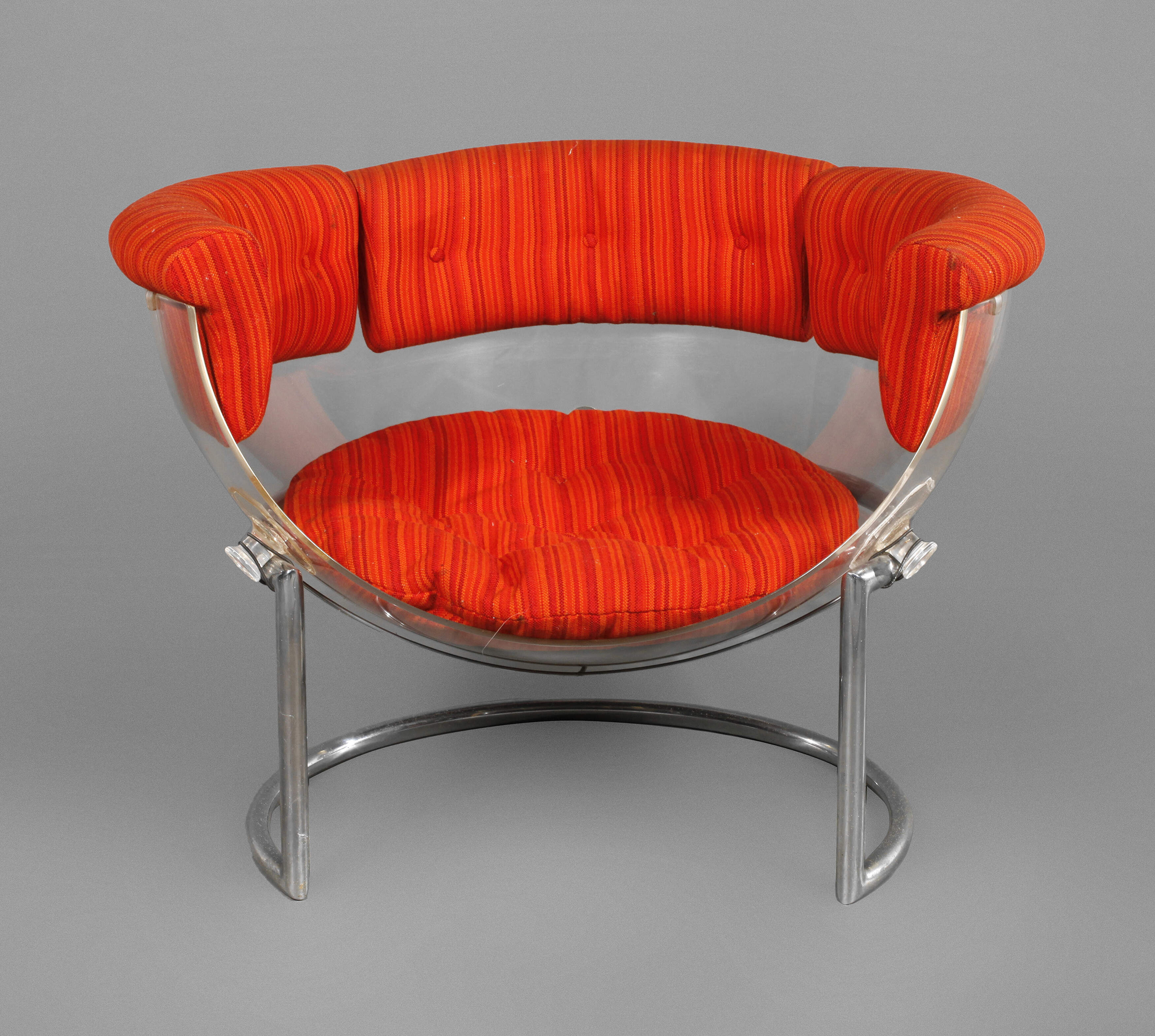 für Eugen Schmidt GmbH Darmstadt, 1970er Jahre, halbkreisförmige Sitzschale aus Plexiglas mit lose eingehängten Polstern, originaler orangefarbener Stoffbezug, auf halbrundem verchromten Gestell, die vorderen zwei Auflagen nachträglich verleimt, Halterung eines Polsters gelockert, Alters- und Gebrauchsspuren, H 67 cm, D 92 cm.