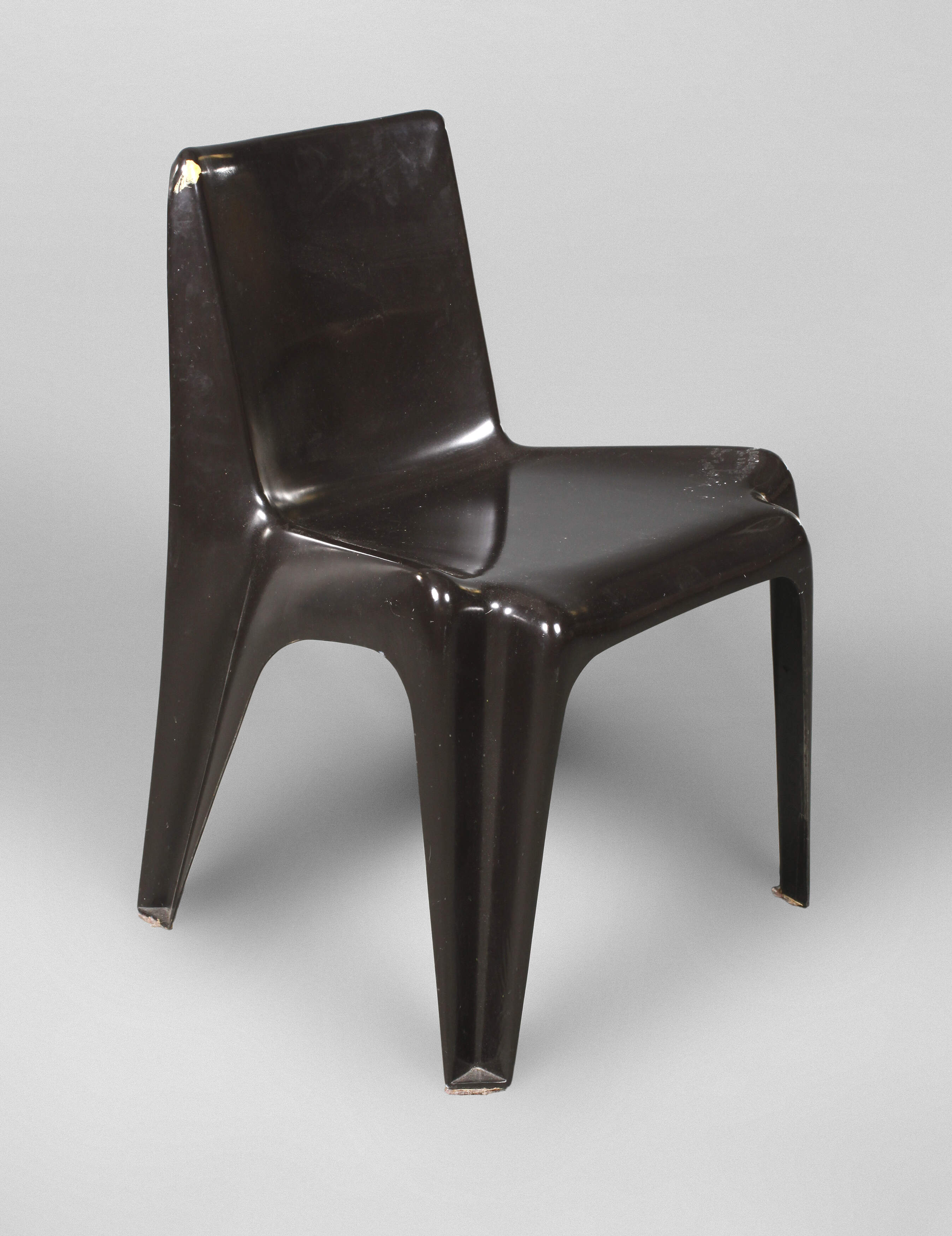 Modell B1171, Entwurf Helmut Bätzner 1960er Jahre für Wilhelm Bofinger Ilsfeld, auf der Unterseite gemarkt, Stapelstuhl aus Kunststoff dunkelbraun lackiert, die Lehne mit kleinem Farbklecks, sonst normale Gebrauchsspuren, H 75 cm, SH 44 cm.