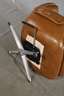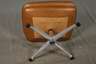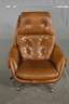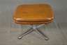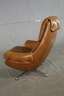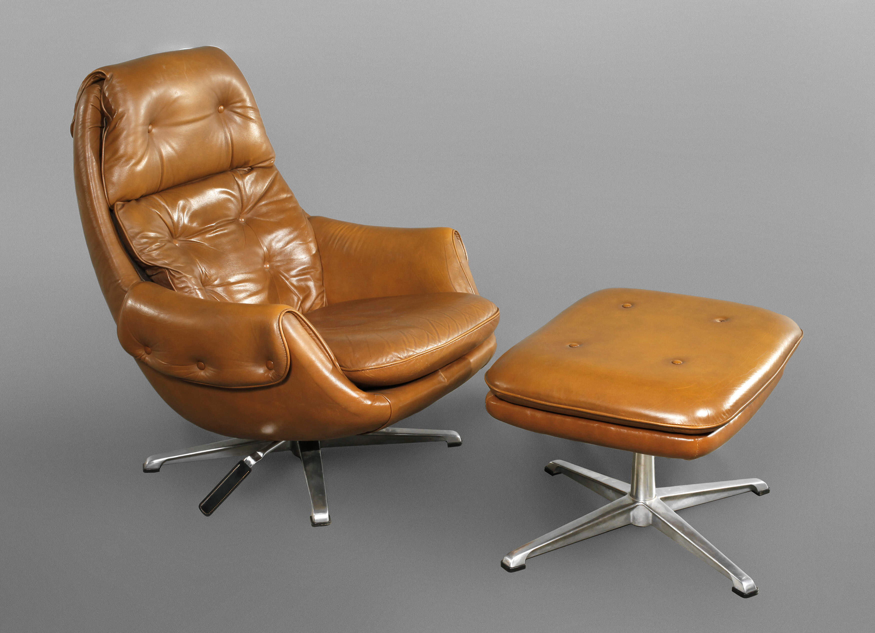 1970er Jahre, ohne Hersteller, brauner Lederbezug, drehbar gelagerter Sessel mit Kippfunktion, dazu passende Ottomane, ein Knopf der Ottomane fehlt, Alters- und Gebrauchsspuren, Maße Sessel 90 x 80 x 80 cm.
