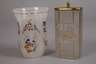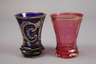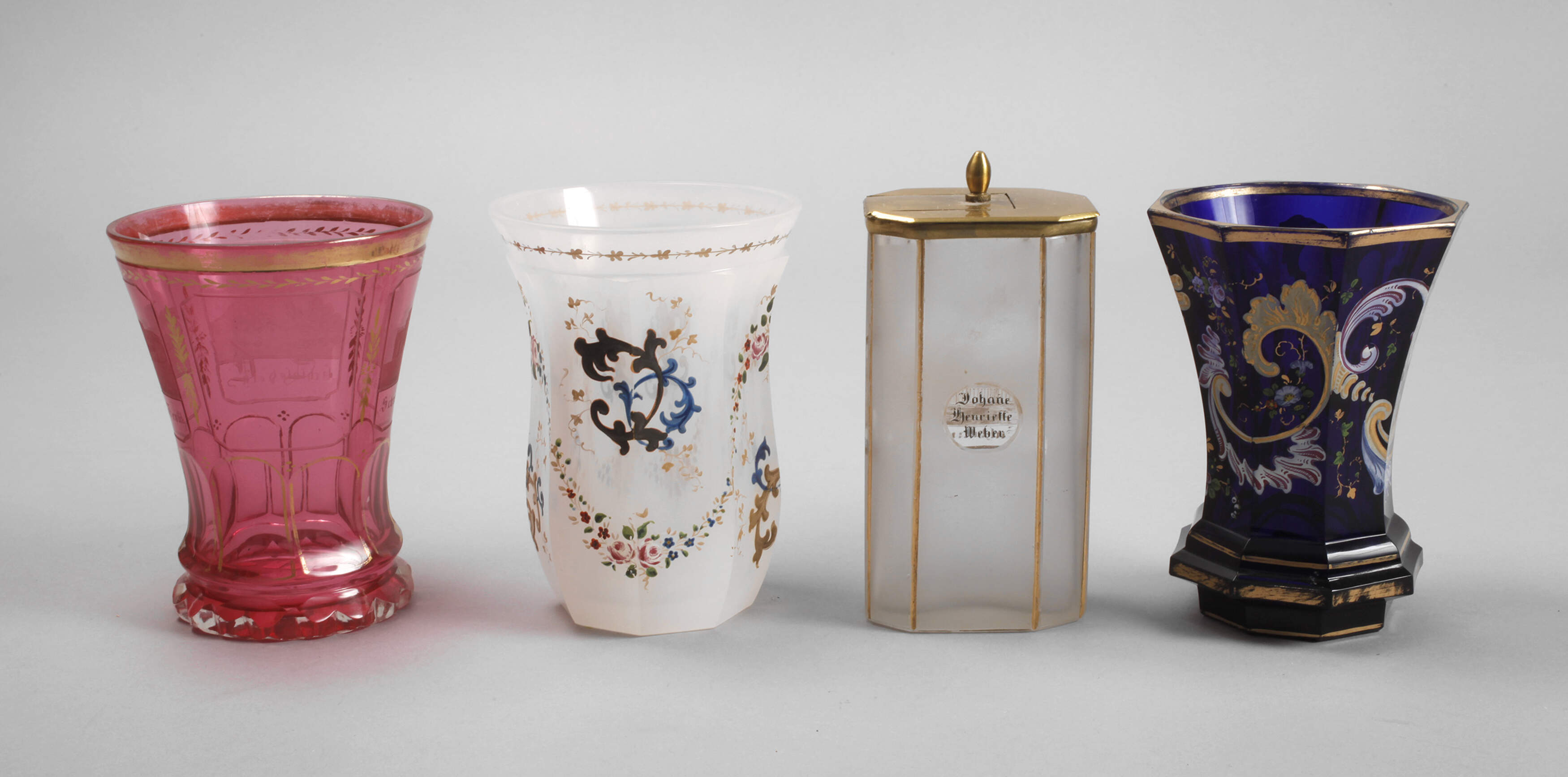 1. Hälfte 19. Jh., drei Becher aus kobaltblauem, roséfarbenem und weißem Opalglas, geschliffen, vergoldet und emailliert, dazu eine Teedose Salzbrunn mit Besitzername Johanne Henriette Weber, Messingmontierung mit seitlich aufschiebbarem Deckel, die Vergoldung teilweise berieben, sonst altersgemäßer Zustand ohne Beschädigungen, H max. 14 cm.
