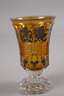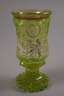 1. Hälfte 19. Jh., einer aus Uranglas, Walzenschlifffuß, Schäl- und Kugelschliff, goldkonturierte Emaillebemalung, Vergoldung partiell berieben, der andere Becher aus farblosem Glas mit Gelbbeize, versilbert und partiell vergoldet, Facetten mit Steinelschliff-Ornamenten, Vergoldung ebenfalls berieben und ein kleiner Chip am Lippenrand, H je ca. 15,5 cm.