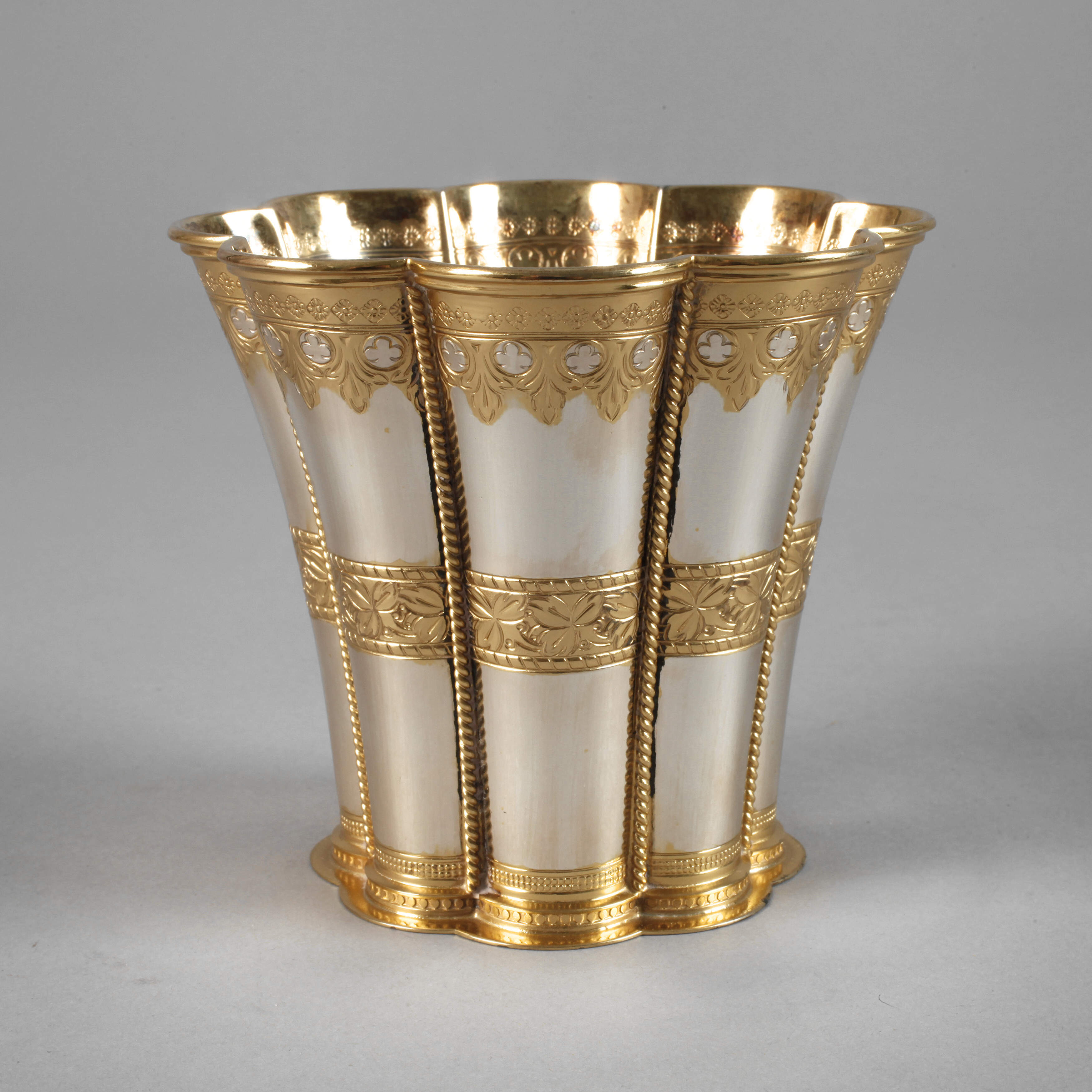 datiert 1972, Silber gestempelt Sterling Denmark, V9 X, Herstellermarke Anton Michelsen, königlicher Hofjuwelier, am Boden gravierte Widmung Vigg Petersen 21-12-72 Volvo Bil A/S, Vermeil, gerippter Becher mit vertikalen gedrehten Bändern, Wandung umlaufend graviert mit floralen und ornamentalen Motiven, minimale Altersspuren, H 9,5 cm, G ca. 249 g.