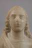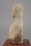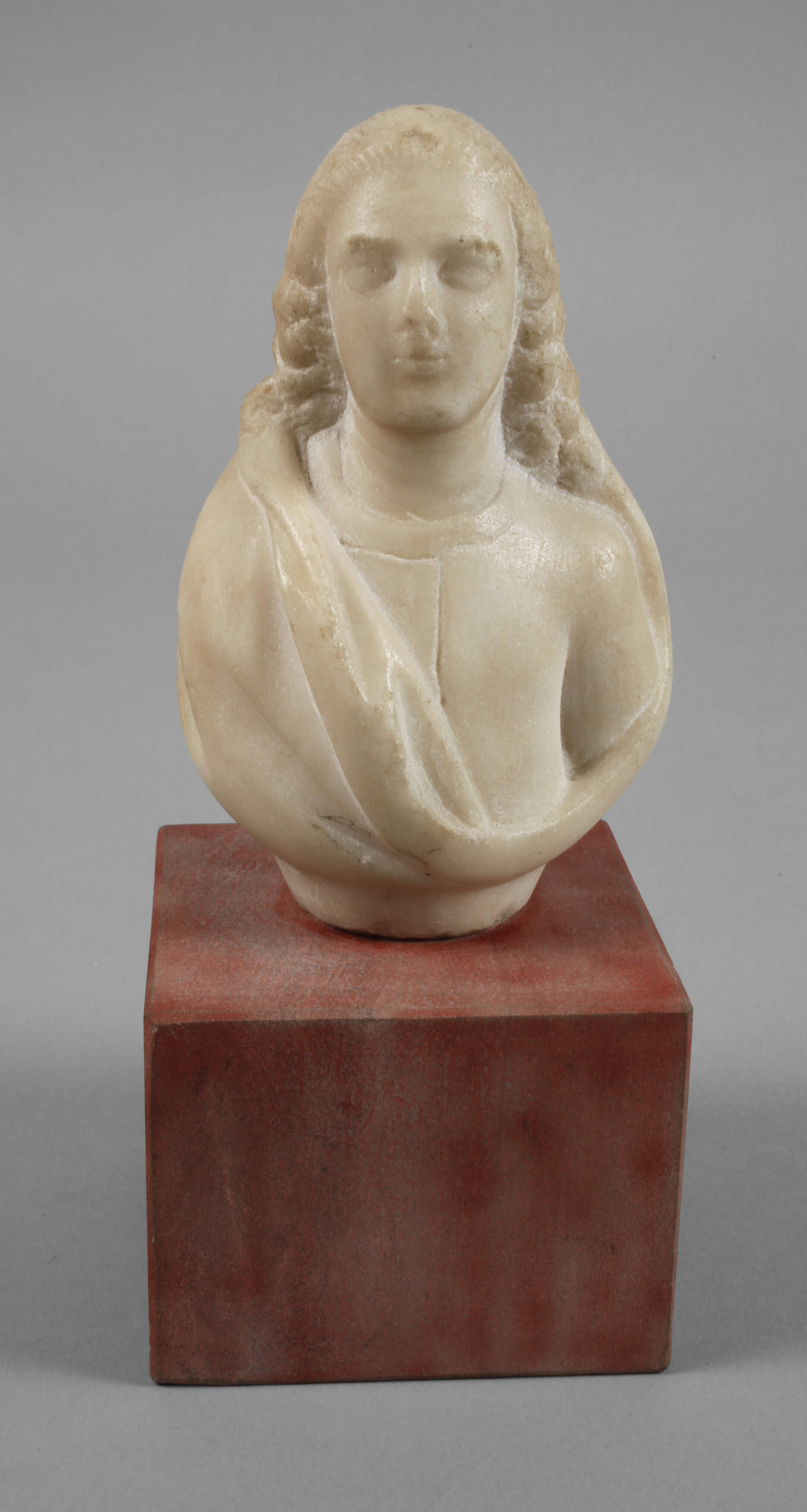 unbestimmten Alters, unsigniert, Alabaster, Darstellung eines Herrn im Stil des Barocks mit langem Lockenhaar und drapiertem Umhang, auf späteren, rotgefassten Sockel aus Steinguss montiert, starke Altersspuren, H Büste 16,5 cm, H gesamt 24 cm.