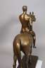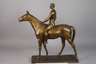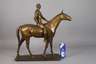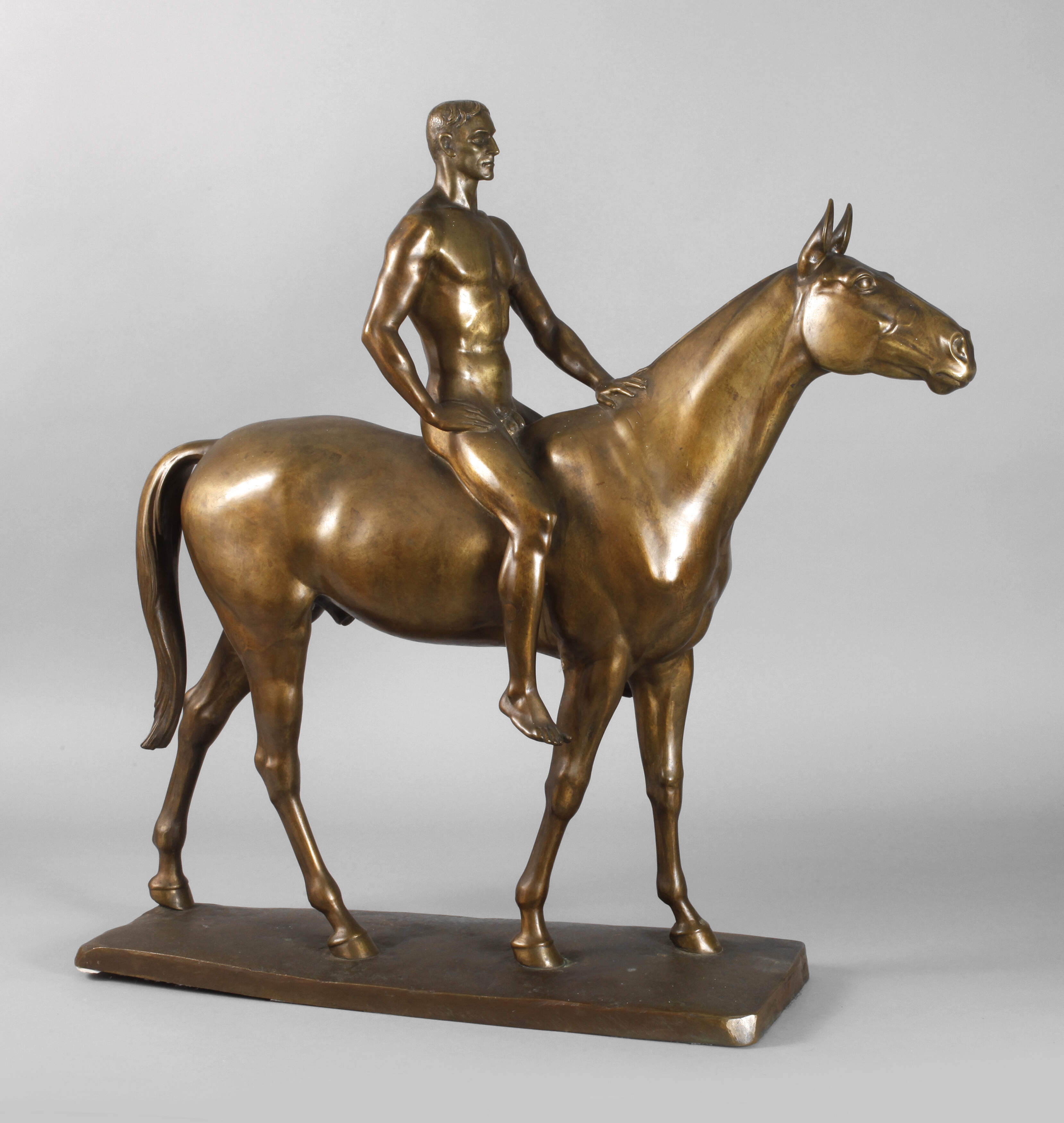 verkleinerte Version des Reiterehrenmals in Lüneburg, datiert 1942 und signiert A. Waterbeck, Bronze nuanciert braun patiniert, naturalistische Darstellung eines Männeraktes in heroischer Pose, auf einem ungesattelten und ungezäumten Pferd sitzend, verkleinerte Version des als überlebensgroßes Reiterstandbild zur Ehrung des 13. Kavallerieregiments in Lüneburg aufgestellten Originals, dieses wurde 1939 vor der Schlieffenkaserne in Lüneburg aufgestellt und 1956 nach der Restaurierung in die Parkanlage am Schifferwall umgesiedelt, Modell standen August Waterbeck seinerzeit ein Wachtmeister des Regiments und das berühmte Springpferd "Wotan" (damals geritten von Hermann von Nagel und siegreich in Nationenpreisen sowie der legendären von Mussolini gestifteten Coppa d'Oro in Rom), auf langrechteckiger Plinthe, diese nicht ganz gerade, Patina partiell berieben, H 78 cm. Info: dieses Objekt muss mit einer Spedition versendet werden. Künstlerinfo: deutscher Bildhauer (1875 Amelsbüren bis 1947 Hannover), 1893 bis 1896 Ausbildung in der Werkstatt für kirchliche Kunst Wiedenbrück als Holzschnitzer, 1897 bis 1902 studierte er bei Edmund von Hellmer in Wien, ab 1903 in Hannover freischaffend tätig, ab 1920 Mitglied im Hannoverschen Künstlerverein und in der Alten hannoverschen Tischgesellschaft, er war mehrfach auf der großen Deutsche Kunstausstellung vertreten. Quelle: Wikipedia sowie Thieme-Becker/Vollmer, Allgemeines Lexikon der Bildenden Künstler, Verlag Seemann Henschel GmbH & Co. KG.