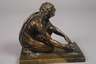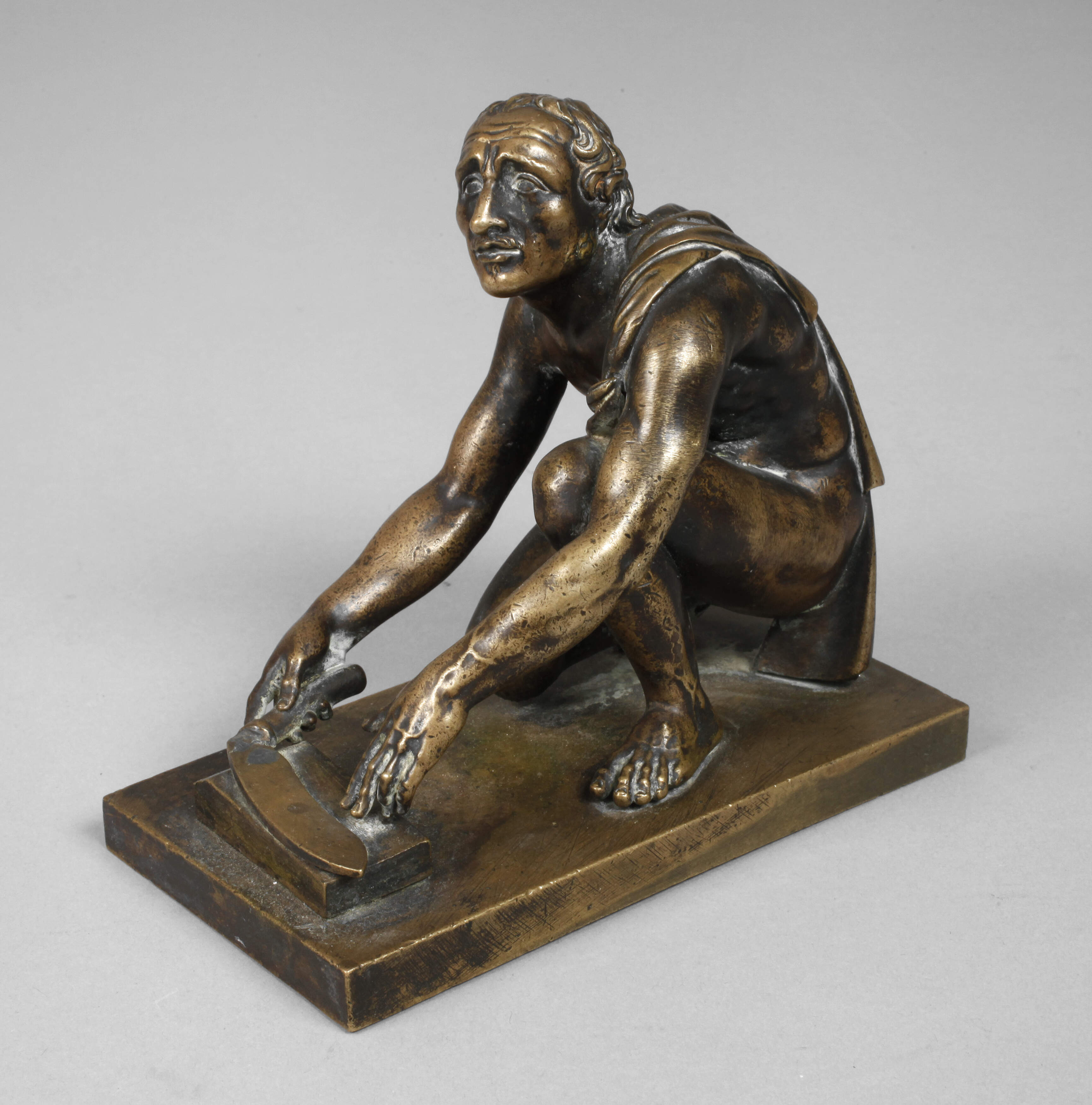 19. Jh., unsigniert, Bronze hell patiniert, Rezeption nach einer späthadrianischen Replik, diese wird in den Uffizien in Rom ausgestellt (Inventarnummer 230), Darstellung eines Angehörigen des im 8./7. Jh. v. Chr. im Bereich des südlichen Russlands angesiedelten Reitervolks beim Schleifen seines Messers, auf rechteckiger Plinthe, Altersspuren, H gesamt 13 cm, L 14 cm. Quelle: Arachne Datenbank, Inventarnummer 1065991.