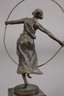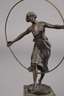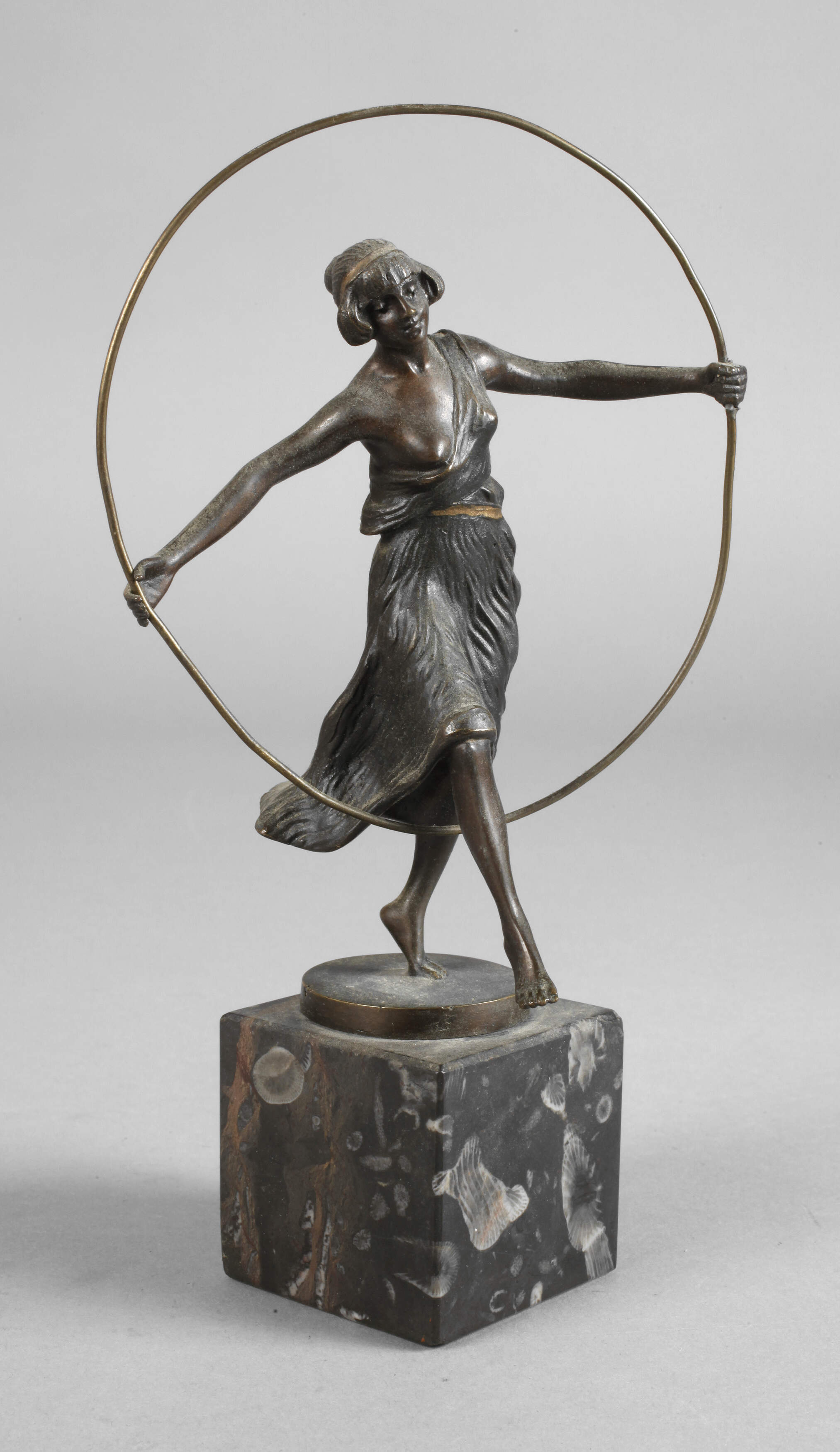 um 1910, unsigniert, Bronze dunkel patiniert, Reifentänzerin im fließenden Kleid, eine Brust frei lassend, auf kleiner runder Plinthe, auf dunklem Steinsockel mit maritimen Einschlüssen, Reifen minimal verdrückt, reinigungsbedürftig, H Bronze 15 cm, H gesamt 20 cm.