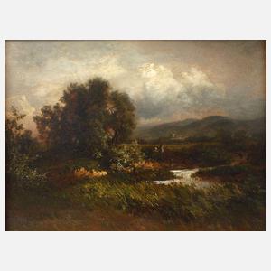 weite Vorgebirgslandschaft mit Bach, unter effektvoll bewölktem Himmel, bei aufziehendem Gewitter, wohl Landschaft aus Oberbayern, hierzu bemerkt Thieme-Becker "... wirkten entscheidend auf seinen wohltemperierten akademischen Stil. ... Seinem fleißigen Pinsel entstammten in den folgenden Jahren zahlreiche Landschaften, zumeist Veduten, alte Burgen und Gewitterstimmungen. ...", pastose Malerei in dunkeltoniger Farbigkeit, Öl auf Karton, 2. Hälfte 19. Jh., links unten im Bereich einer Restaurierung bezeichnet "By. S.", rückseitig auf dem Karton undeutliche Annotation "Brodszky Sándor ..." in Blei, Malgrund partiell wellig, restauriert, gerahmt, Falzmaße ca. 22,5 x 32 cm. Künstlerinfo: auch Sandor Brodszký, deutsch: Alexander Brodszky oder frz.: Alexandre Brodszky, ungarischer Maler und Fotograf slowakischer Abstammung (1819 Tóalmás bis 1901 Budapest), ab 1838 Studium der Medizin in Pest, 1841-45 Wechsel zum Studium der Malerei an die Akademie Wien, hier Schüler von Josef Mössmer und Franz Steinfeld den Jüngeren, ab 1845 Weiterbildung in München bei Albert Zimmermann und Friedrich Voltz, beeinflusst von Carl Rottmann, Anton Ligeti und Carl Markó, ab 1845 Mitglied des Münchner Künstlervereins, in München Bekanntschaft zu seinem Landsmann József von Molnár, mit dem er ab 1846 zwei Jahre durch Bayern, die Schweiz und Tirol reiste, beschickte ab 1842 die Ausstellungen des Pester Künstlervereins und ab 1847 den Münchner Kunstverein, 1856 Rückkehr nach Pest, hier tätig für Kaiser Franz Joseph I. und die ungarische Regierung, führte mit Józef Molnár 1862-64 in Györ ein Fotoatelier, galt nach 1870 als Traditionalist und wertkonservativer Landschaftsmaler im Geiste der Wiener und Münchner Schule, Quelle: AKL, Thieme-Becker, Saur "Bio-Bibliographisches Künstlerlexikon", Müller-Singer, Boetticher und Wikipedia.