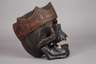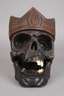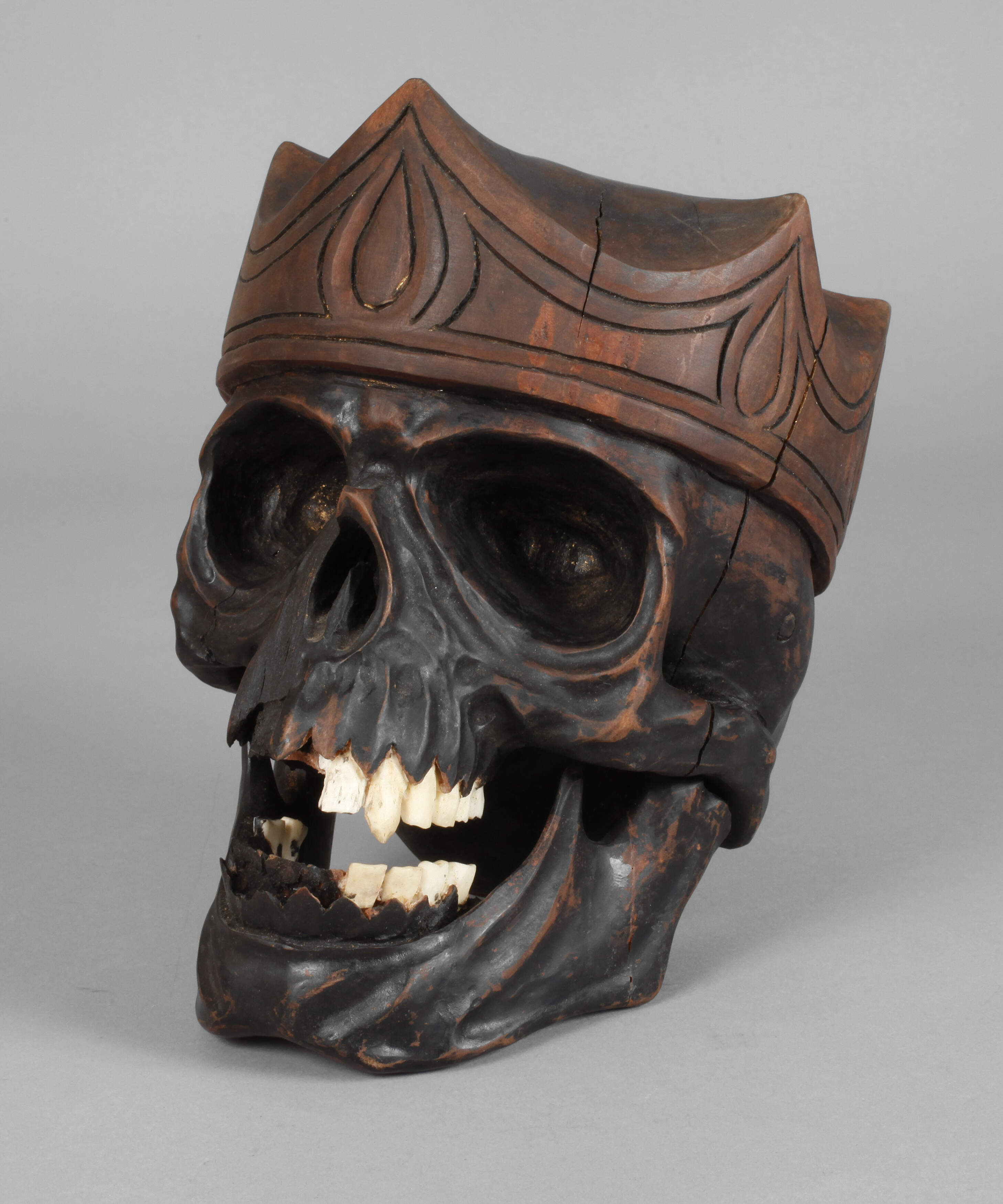 Ende 19. Jh., Laubholz massiv, dunkel gefasst und beschnitzt, Darstellung eines menschlichen Schädels mit eingesetzten Zahnreihen aus Bein, der Kiefer mittels Federmechanismus beweglich gelagert, Substanzverluste, H 25 cm.