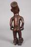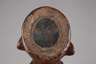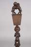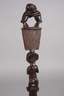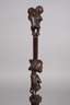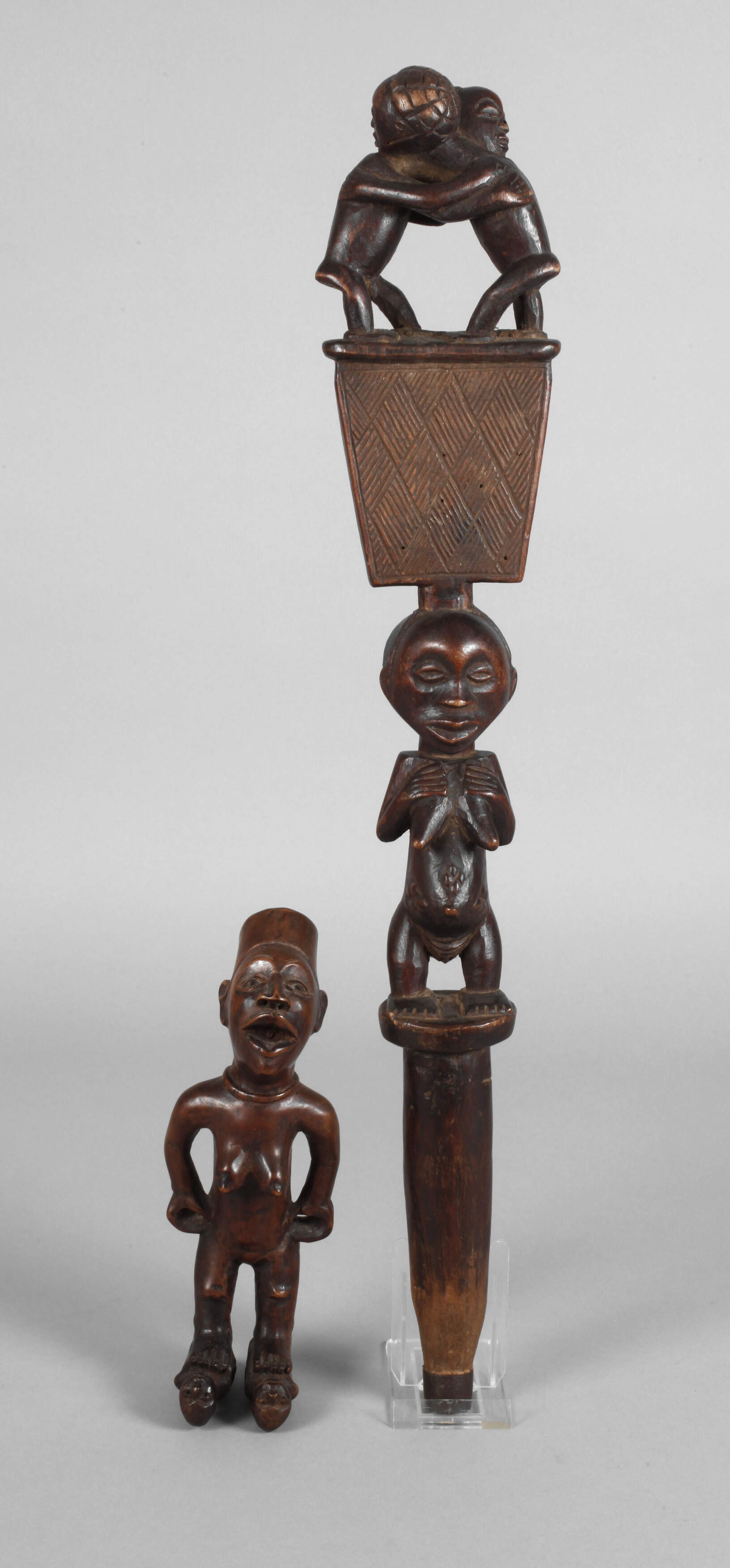 Zeremonialstab, der Volksgruppe der Luba zugeordnet, Zentralafrika, 20. Jh., dunkles schweres Tropenholz aufwendig beschnitzt, paddelförmig gestaltetes Ritualobjekt mit schlichtem Griffstück, dieses bekrönt von vollplastisch gearbeiteter weiblicher Standfigur, konisch zulaufender Aufsatz ornamental staffiert, darüber zwei Männer im Kampf, dazu Zauberfigur eines weiteren Stammes, als weibliche Gestalt, unter deren Füßen sich zwei Figuren winden, die kappenförmige Kopfbekrönung verglast, kleine Fehlstelle, Altersspuren, H 67 und 26 cm.