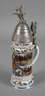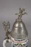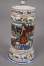 bezeichnet "Kgl. bayr. 10. Feld Art. Regt. 2. Batt. 1912/14 Erlangen“, Namensangabe Fahrer Schübel, schauseitig 10er Schulterklappe, Bayerisches Wappen und König Ludwig III. unter Manöverszenen, die sich seitlich ausbreiten, oben und unten Eichenlaubdekor, hinten zwei Namensleisten, Bodenlithophanie Abschiedsszene, hoher Zinndeckel in Form eines Geschosskopfs, als Abschluss ein Reiter mit aufsteigendem Pferd, der Drücker als Bayerischer Löwe mit Wappen, guter Zustand, H max. 33 cm.