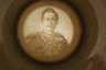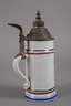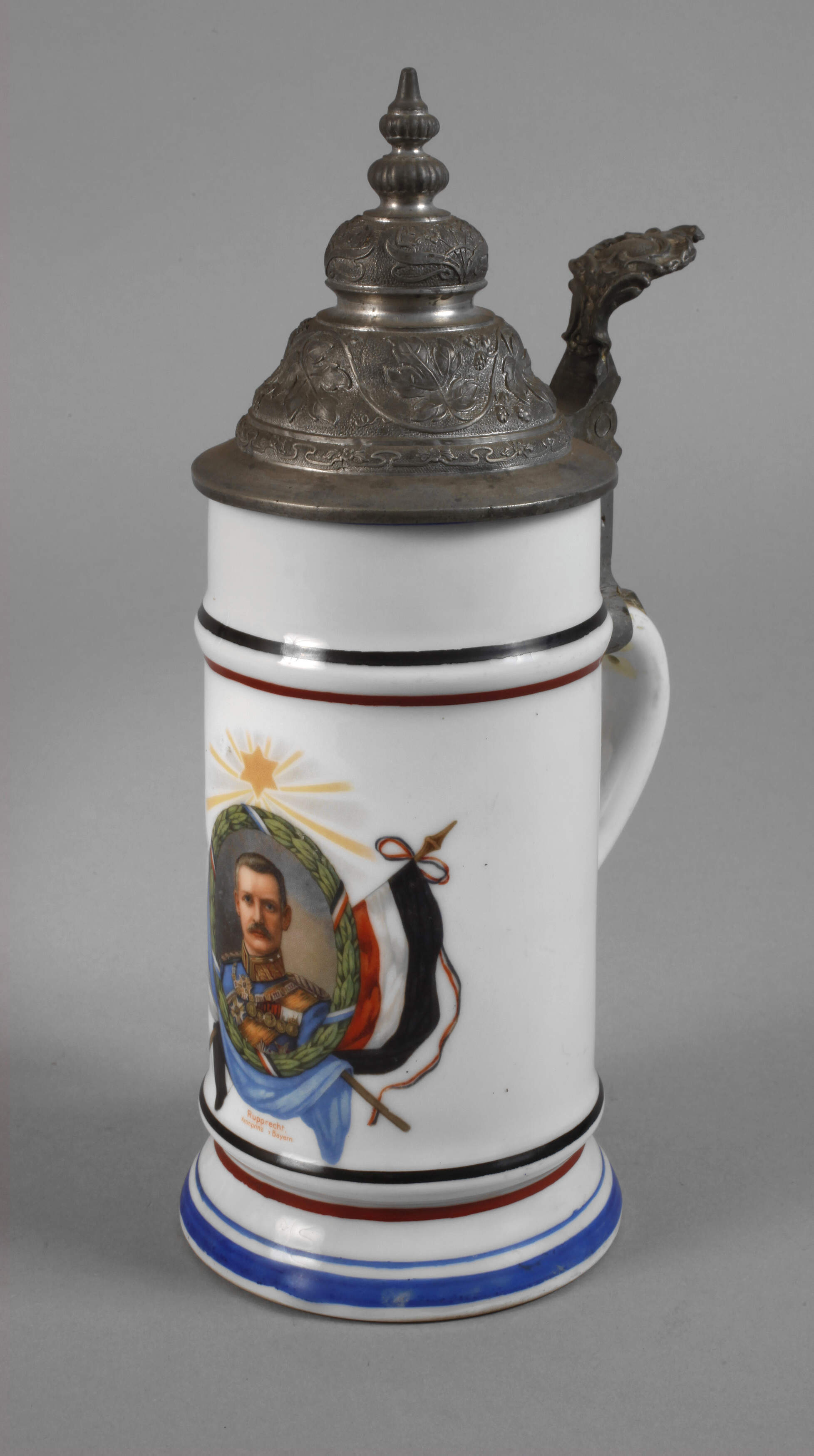 um 1900, schauseitig Bildnis des Kronprinzen Rupprecht von Bayern in Uniform im Lorbeerkranz, flankiert von der Bayerischen und der Reichsfahne, Bodenlithophanie Kaiser Wilhelm II., erhöhter Zinndeckel, floral verziert, guter Zustand, H max. 25,5 cm.