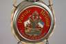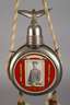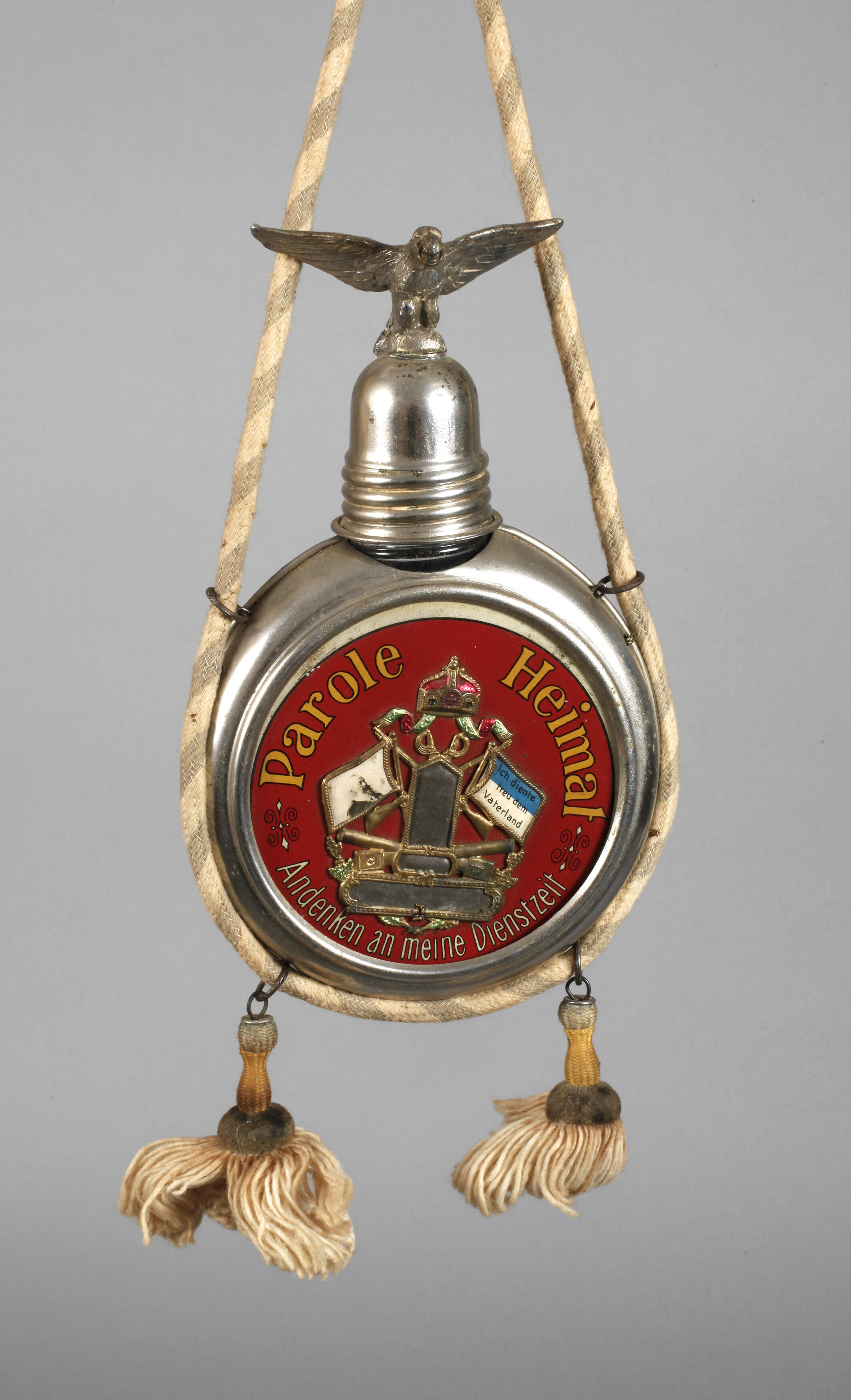 um 1910, ohne Bezeichnung, Glasflasche mit Metallmontur, schauseitig Reservistendekor, Kaiserkrone mit Schulterklappe, Kanonen, Säbeln, König Ludwig III. von Bayern und Umschrift „Parole Heimat, Andenken an meine Dienstzeit“, hinten ein Soldatenbild zwischen zwei Gewehrpatronen und Kaiserkrone, Schraubverschluss als Trinkbecher mit Adlerabschluss, blau-weiße Kordelschur mit zwei Quasten, guter Zustand, H max. 20 cm.