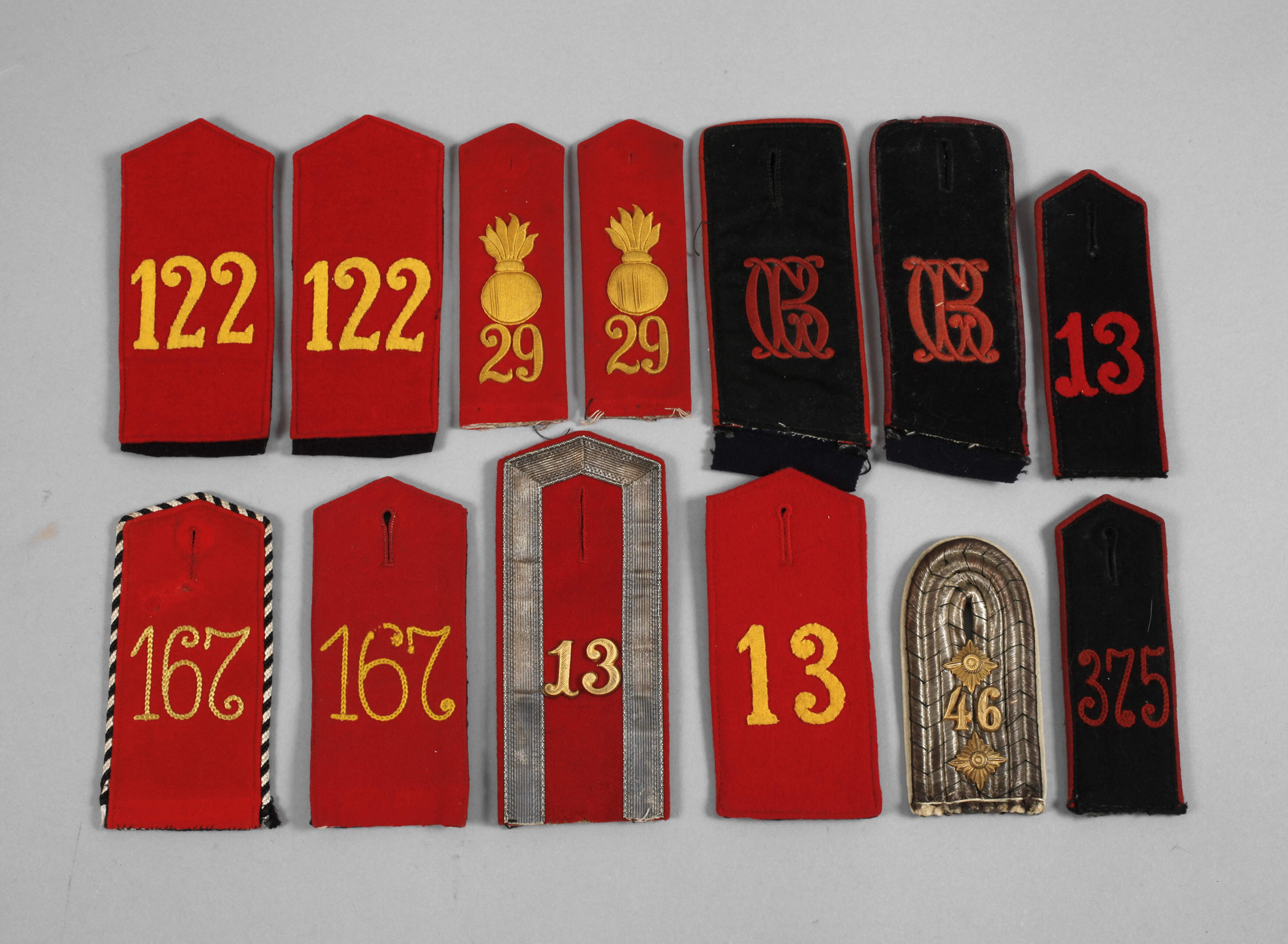 dreizehn Stück für Mannschaften, darunter ein Paar Artillerieregiment 29 sowie neun Einzelstücke verschiedener Regimenter, guter Zustand.