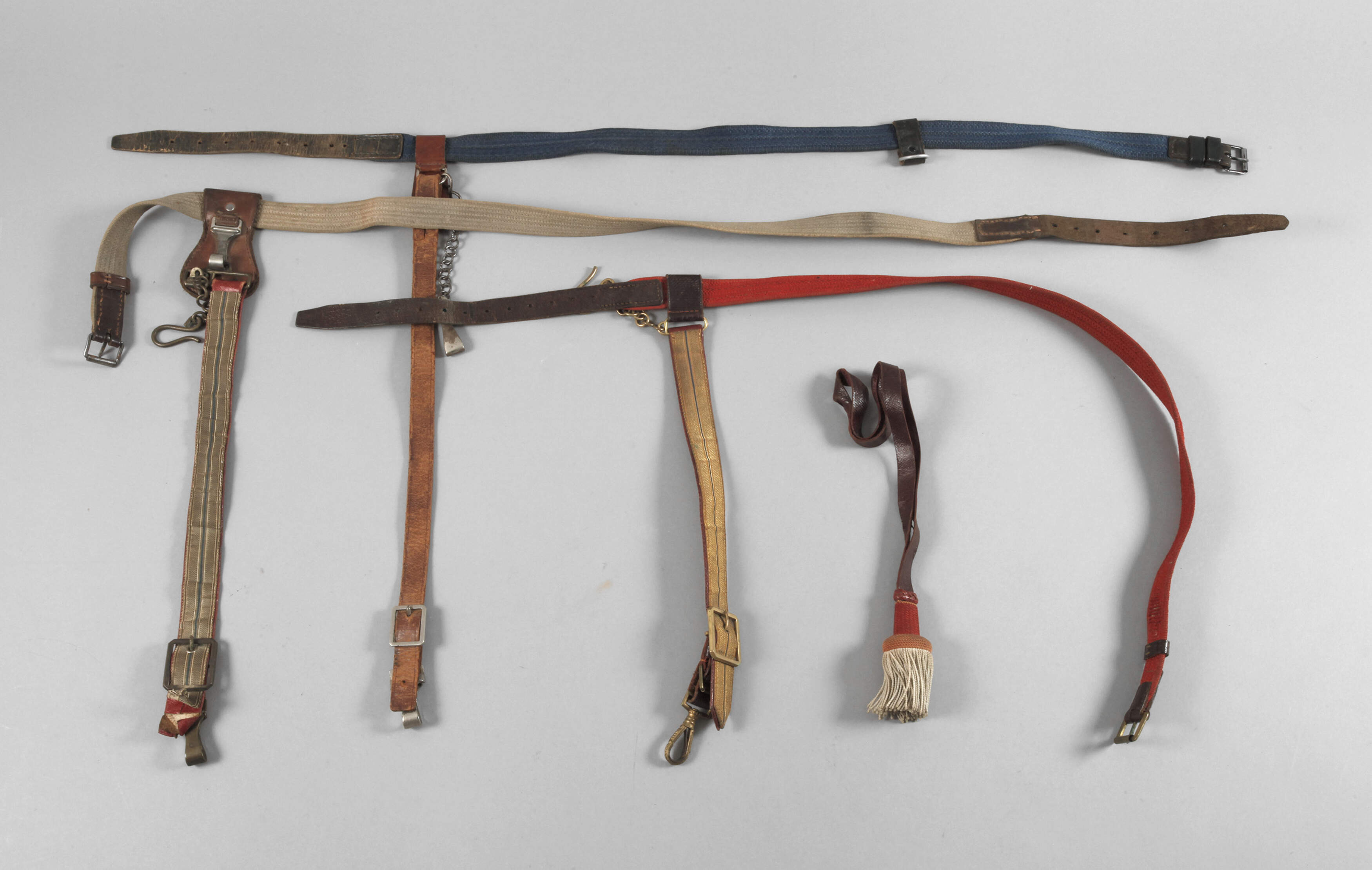 um 1900, für Unteroffiziere, blauer Webriemen, L 93 cm, mit Lederhänger; für Offiziere, beiger Webriemen, L 110 cm, (Karabiner defekt), mit Hänger aus Silbertresse auf rotem Leder sowie roter Webriemen, L 110 cm, mit Hänger aus Goldtresse auf rotem Leder, dazu Portepee, Riemen aus Leder, weiße Wollquaste, rot-orange Fassung, L 46 cm, alles im guten altersgemäßen Zustand.